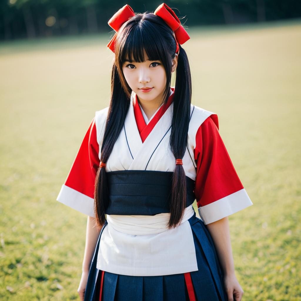 Photo-realistic cosplay photo of person in amayadori machi costume. 1girl, brown eyes, long hair, black hair, brown hair, blunt bangs, twintails, low twintails, small breasts, hakama skirt, miko, miko, red hakama, headbandlifestyle stock photo, shallow depth of field, lifestyle stock photography, shallow depth of field, natural lighting, warm tones, soft background blur, candid moments, vibrant colors, realistic textures, modern casual clothing. full body shot