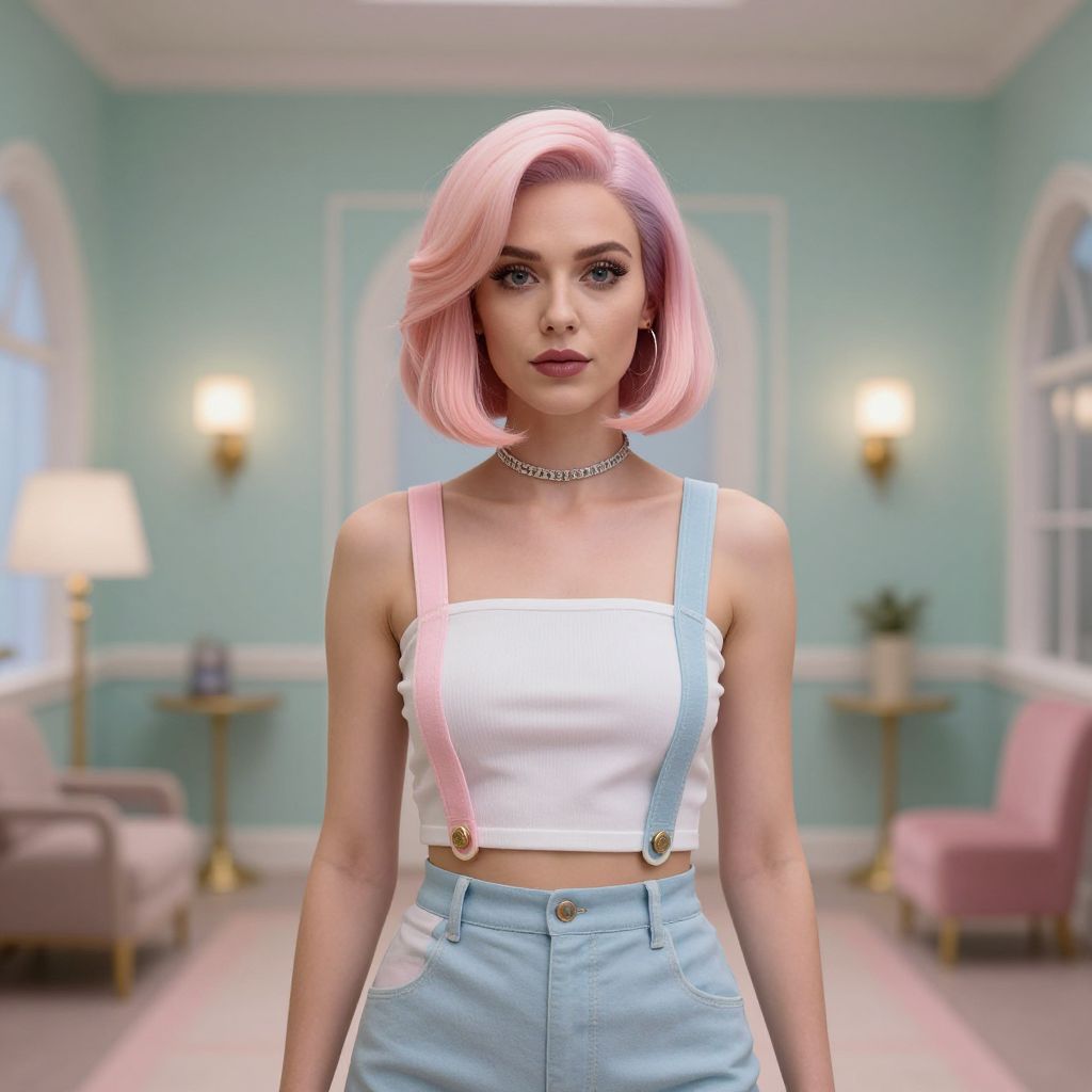 Digital CGI portrait of a pink-haired woman in a white crop top, blue suspenders, and high-waisted jeans, standing in a pastel