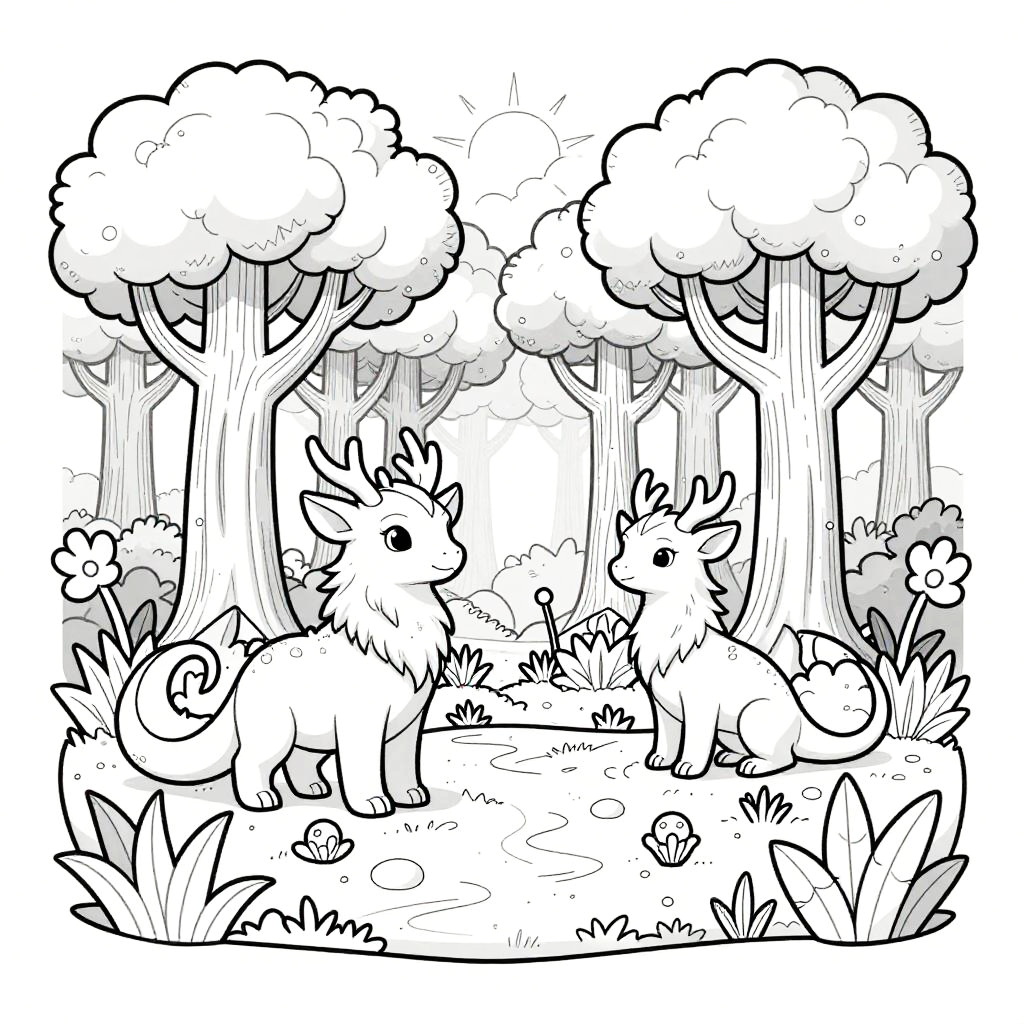 Black-and-white line drawing of two cute, fluffy, deer-like creatures with antlers standing in a forest clearing with large trees and bushes.