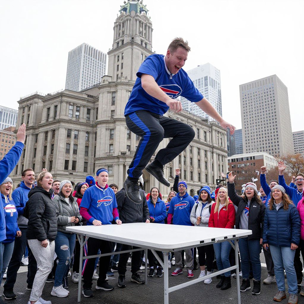 A man in Zubaz pants and a blue shirt jumps through a table in front of a crowd, celebrating in front of Buffalo City Hall during a Buffalo Bills Super Bowl Parade.
