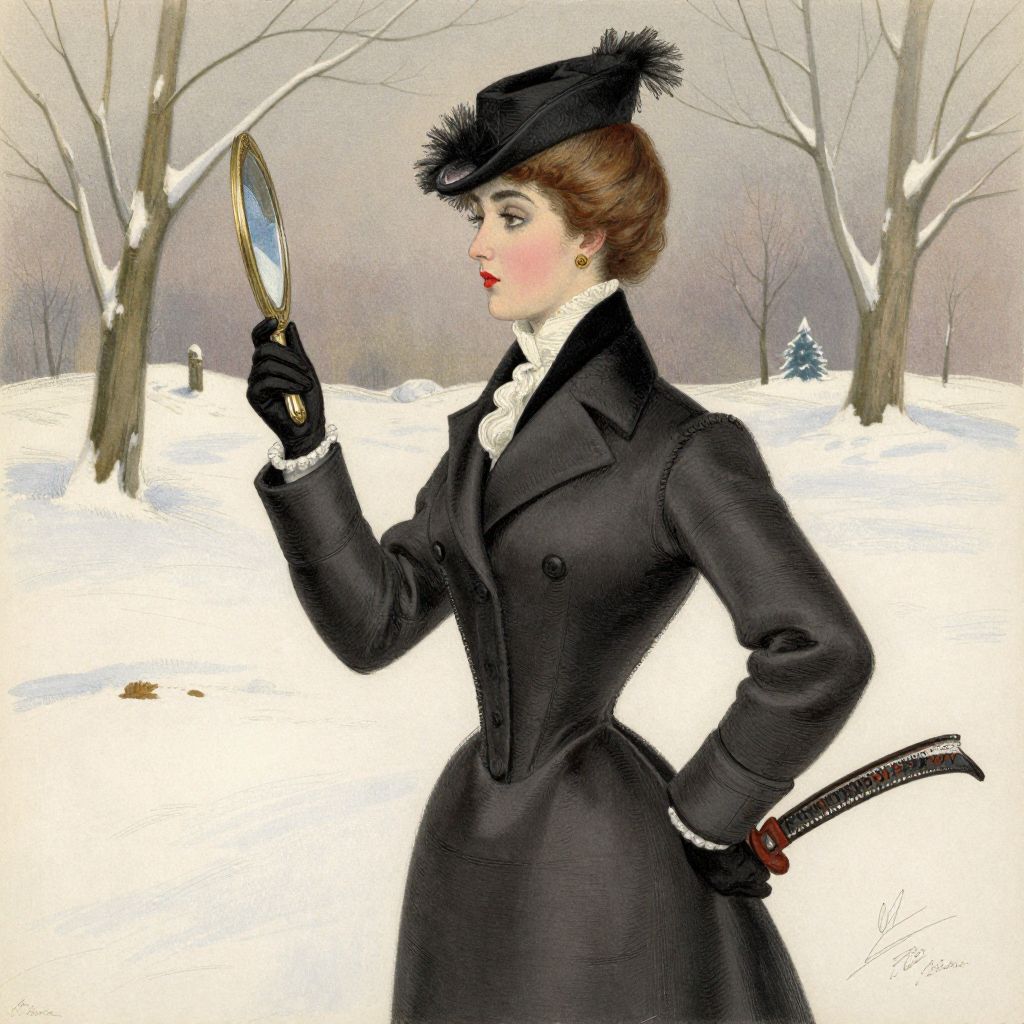 Vintage illustration: Elegant woman in black Victorian coat and hat, holding a compact, standing in snowy forest, hand on hip, sheath on belt.