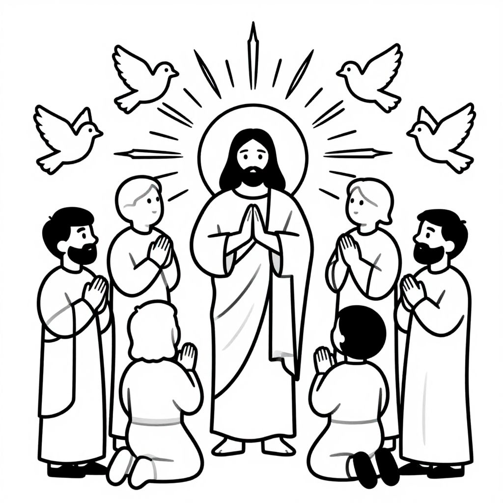 Black and white vector illustration depicting the coming of the Holy Spirit at Pentecost. Features Jesus Christ surrounded by apostles and followers with praying hands, accompanied by four doves representing the Holy Spirit. The scene includes radiant light rays symbolizing divine presence, with bold, thick lines and simple shapes designed for easy coloring by young children.