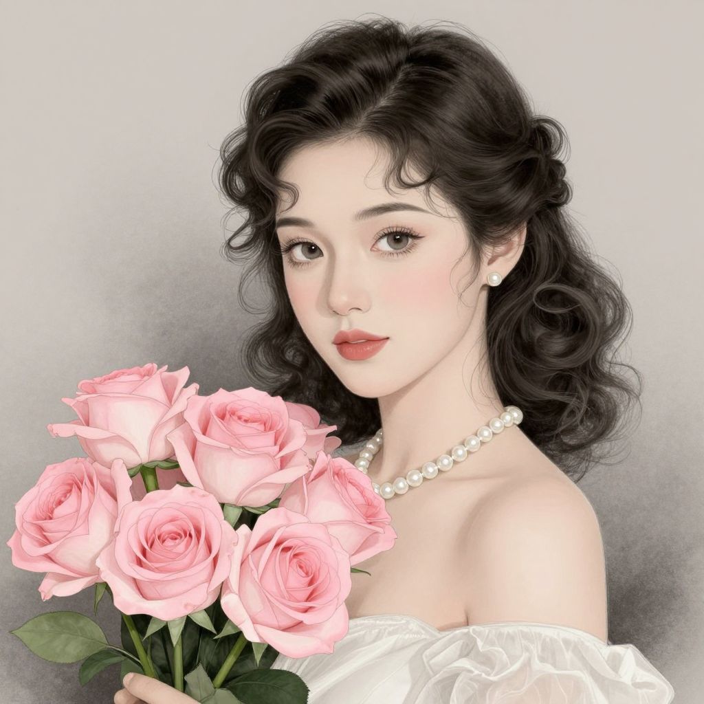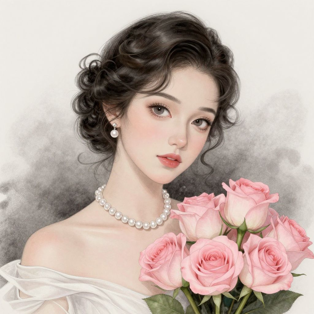 A vintage-inspired digital illustration of a woman with elegant curls, adorned in a pearl necklace and holding a bouquet of pink roses, rendered in a blend of charcoal shading and pastel hues reminiscent of classic portraiture.