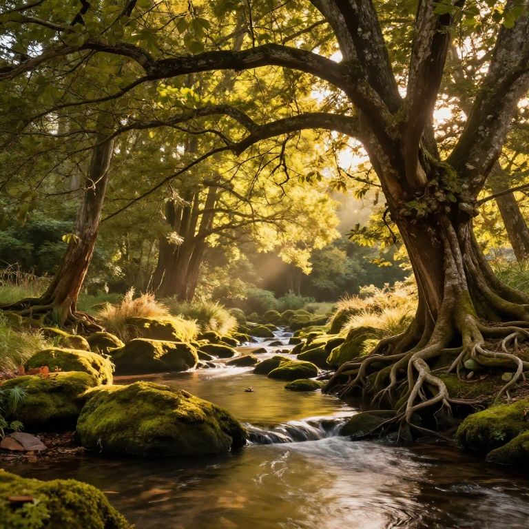 _an_y, serene forest glade bathed in golden sunlight, ancient trees with sprawling roots, gentle stream flowing through moss-covered rocks, peaceful and enchanting mood, hyper-realistic textures