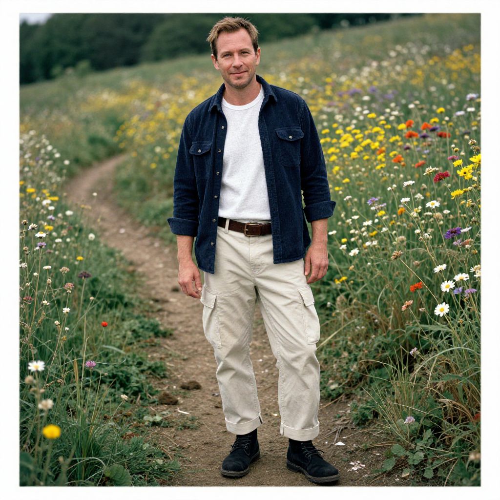 A man, navy corduroy overshirt, white linen t-shirt, beige cargo pants, black suede chukka boots, rugged leather belt, muddy trails winding, vibrant wildflowers blooming, instant film style, relaxed smile. Man has masculine face and piercing eyes