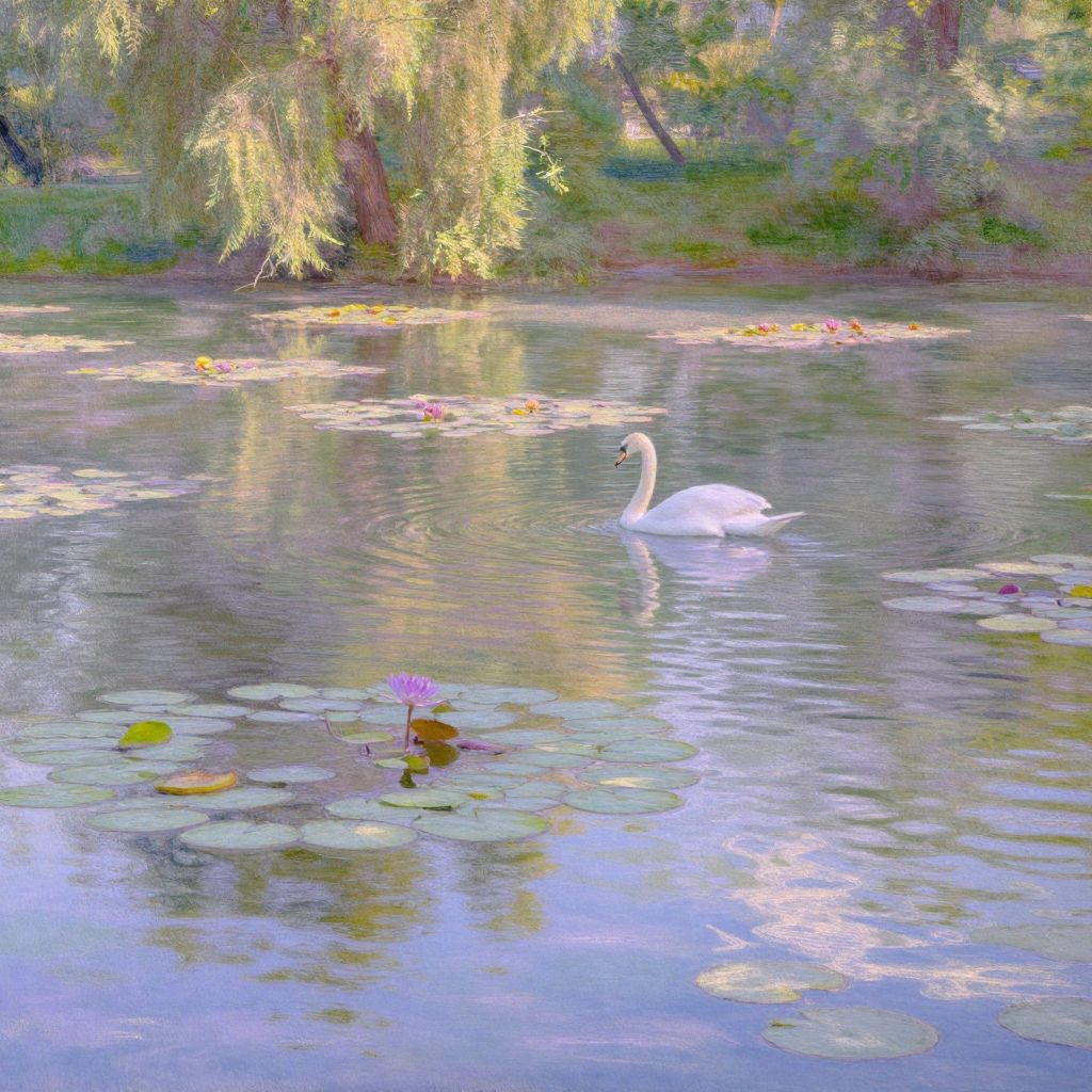 Imagine an impressionistic landscape showcasing the delicate interplay between light and color, reminiscent of Monet's ethereal style. A tranquil pond reflects vibrant water lilies in a soft palette of lavender and pale green, as gentle ripples dance upon its surface. From above, an elegant swan glides gracefully through the shimmering water, its feathers catching the warm golden light filtering through towering willow trees. This serene scene captures fleeting moments of beauty in nature, evoking feelings of peace, wonder, and introspection amidst the ever-changing interplay of light and color across the tranquil pond's surface.