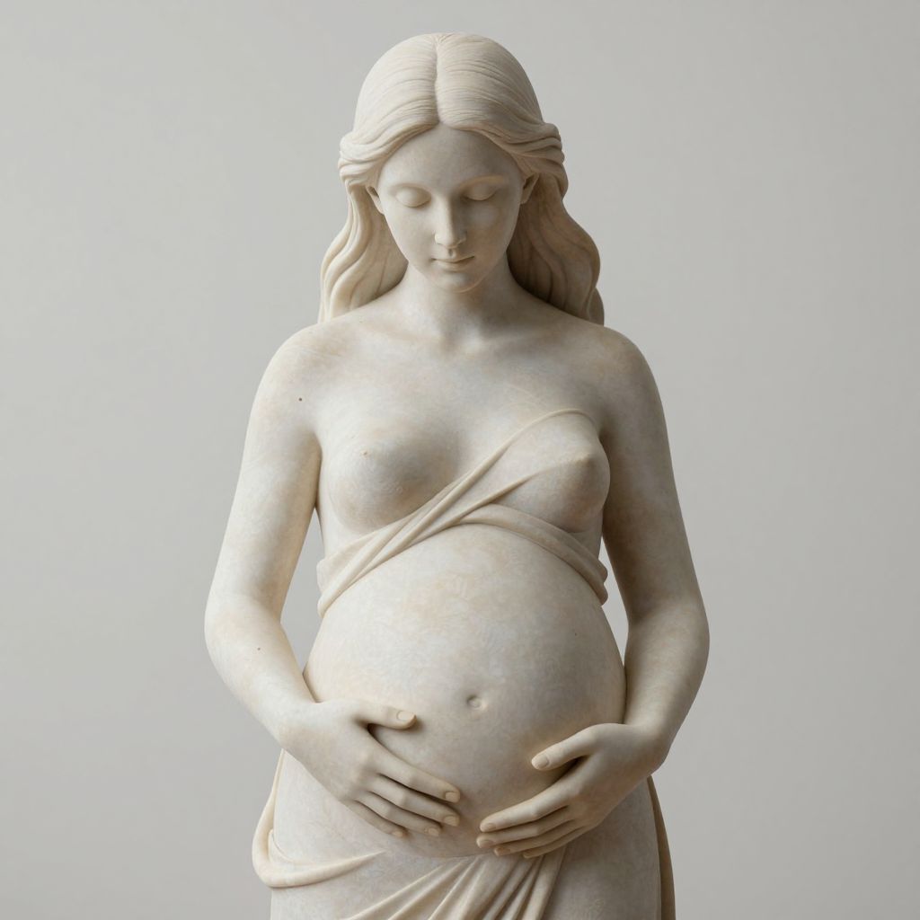 A detailed sculpture of a pregnant woman carved from light-colored stone, depicting serenity and gentle embrace of her belly. The figure has long flowing hair and wears draped fabric, symbolizing new life and hope.