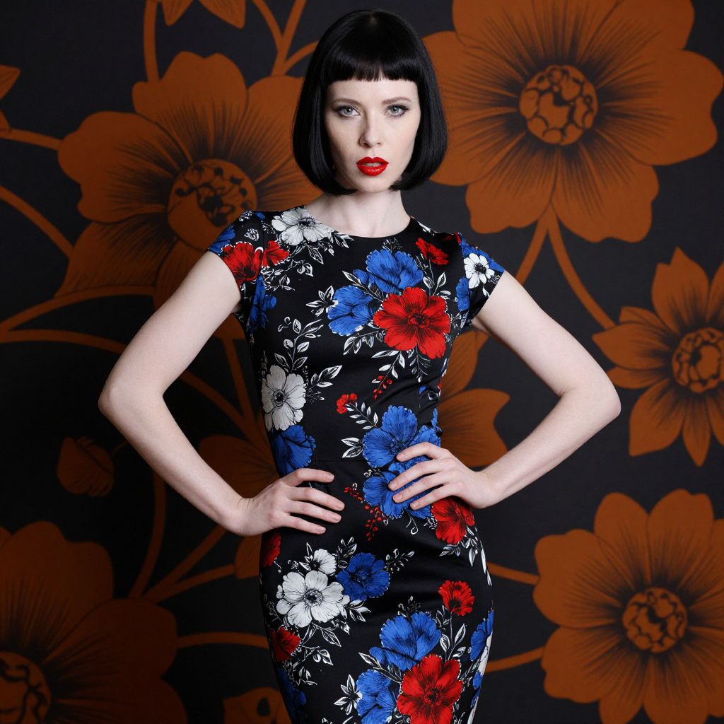 Photograph of a pale-skinned woman with a sleek black bob haircut and bright red lipstick. She's wearing a form-fitting black dress with vibrant blue, red, and white floral patterns. Her hands are on her hips, and she's standing against a dark background with large, orange floral designs. The contrast between her dress and the background makes her pop. She looks confident and stylish.