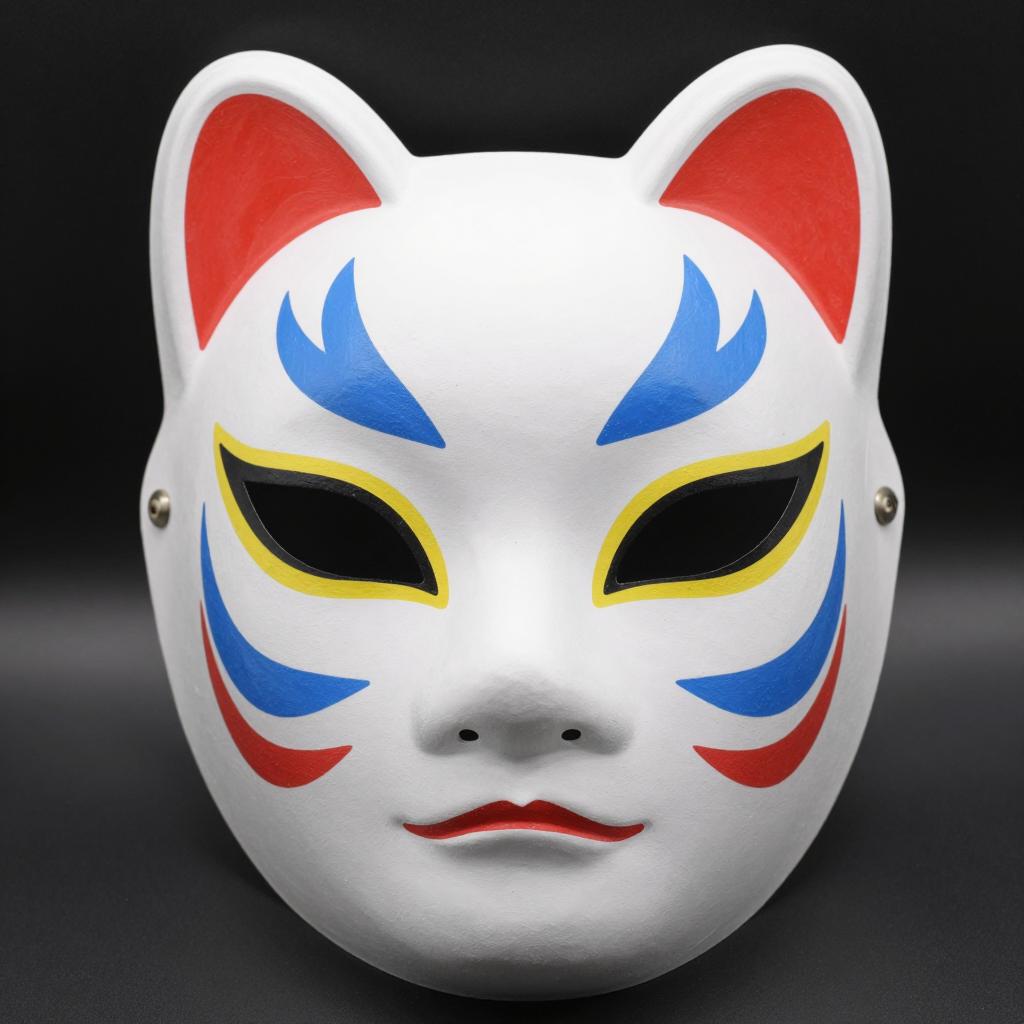 White mask with red inner ears, blue triangular markings, yellow and black almond-shaped eyes, red and blue curved lines around eyes and mouth. Dark background. Photograph. Mask has smooth ure. Centered in frame.