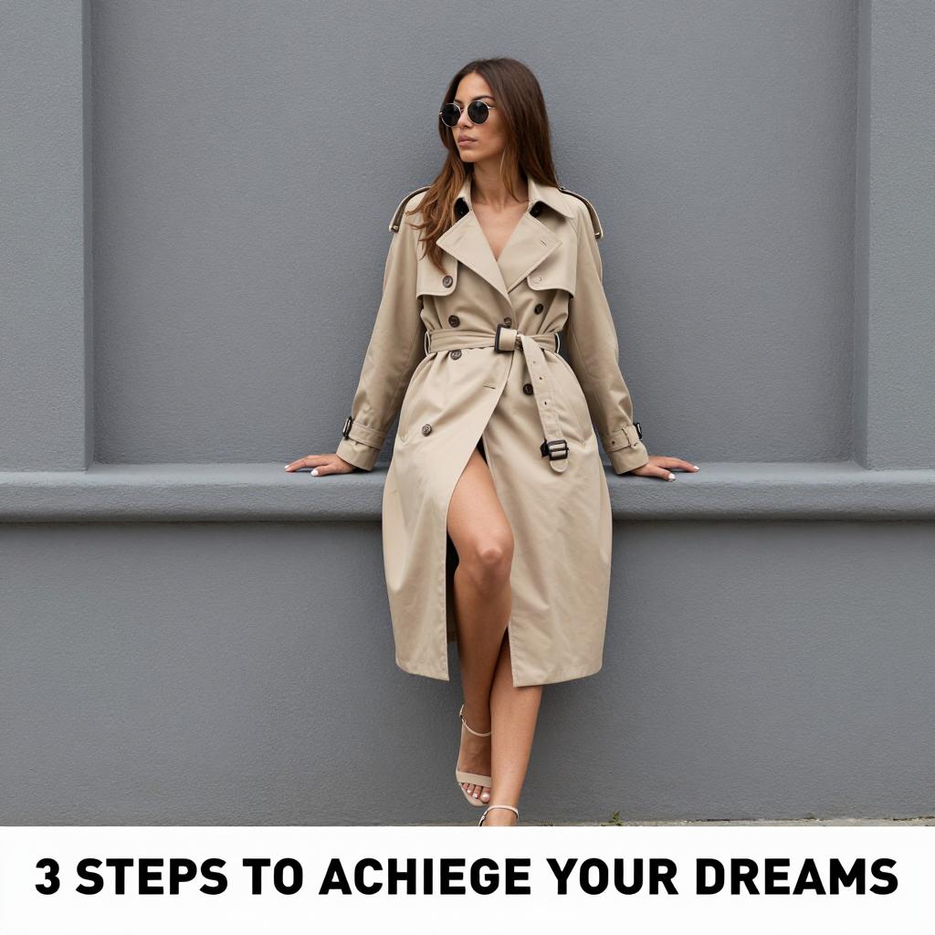Photograph of a woman leaning against a wall. She has light brown skin, long brown hair, and wears round sunglasses, a beige trench coat with a belt, and beige high-heeled sandals. Her left leg is raised, showing her bare thigh. The background is a gray, ured wall with a recessed shelf. The "3 STEPS TO ACHIEVE YOUR DREAMS" is at the bottom.