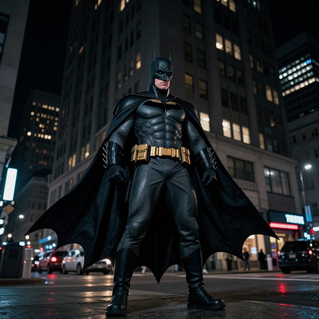 Photograph of Batman standing in a dark, urban nighttime setting. Batman, a muscular figure in a black, glossy costume with a textured chest, wears a black cowl with pointed ears, a flowing cape, and black boots. His belt has a prominent gold buckle. He stands confidently at the intersection of a city street, with tall buildings and illuminated windows in the background. Neon signs and streetlights create a reflection on the wet pavement. The image captures a dramatic, cinematic feel, with Batman's dark figure contrasting against the bright city lights.