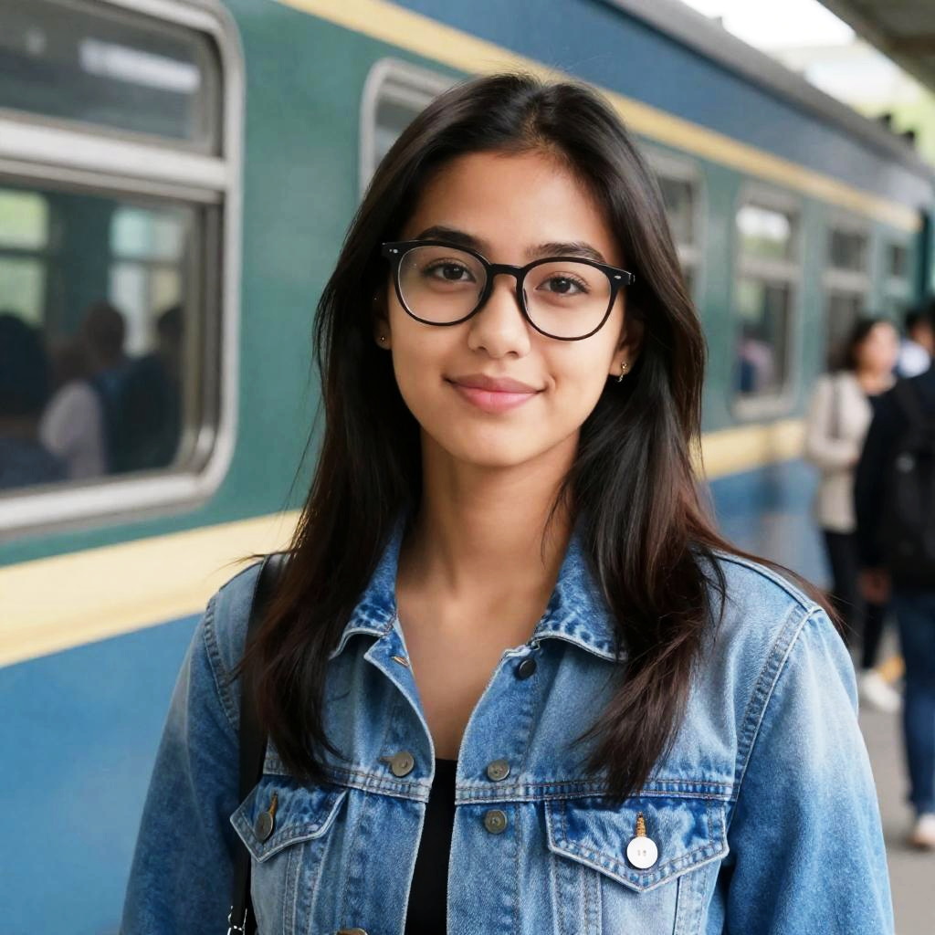Young woman with medium brown skin, long dark brown hair, and black-framed glasses. Wearing a light blue denim jacket, small earrings. Standing beside a blue and green train, blurry background with people. Soft smile, slightly parted lips. One shoulder strap visible. Blurred people in background. Daylight.
