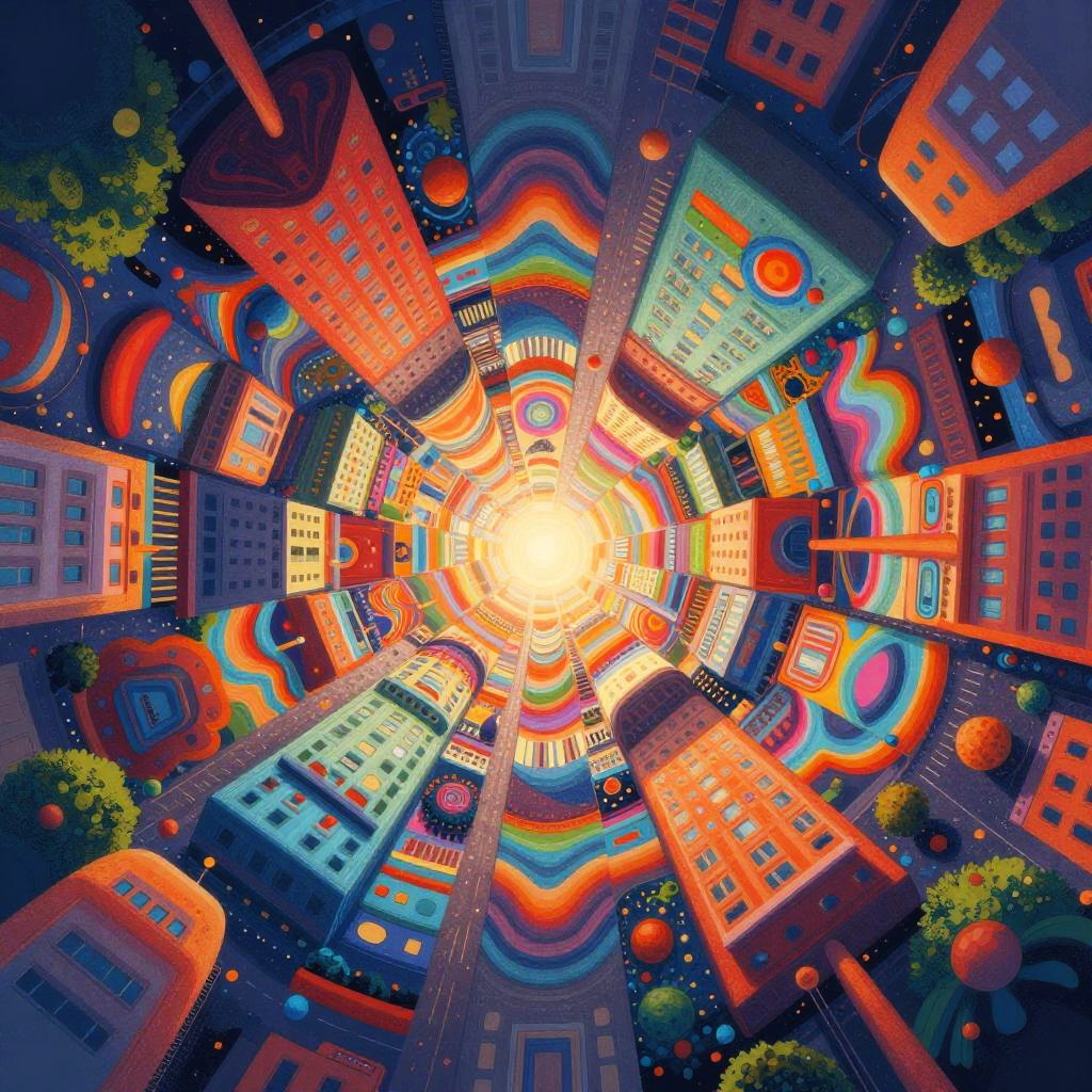 Digital art depicting a vibrant, futuristic landscape with neon-colored hills, winding rivers, towering spires, and a glowing, star-connected central structure.