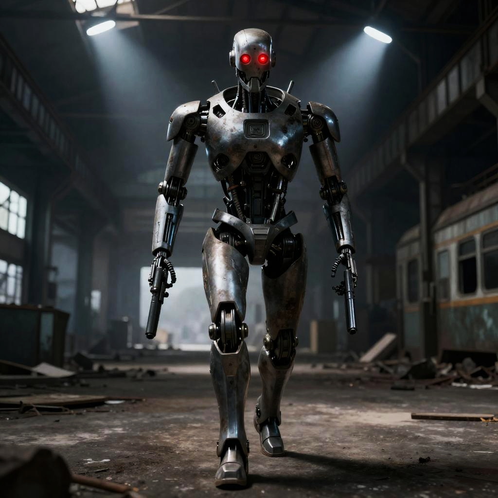 A t800 cyborg with handguns walking through factory ruins, indoors, train station, spotlightes, photorealistic, realistic, dark, horror, frightening, (glowing red eyes:1.0), t800, cyborg, very wide shot