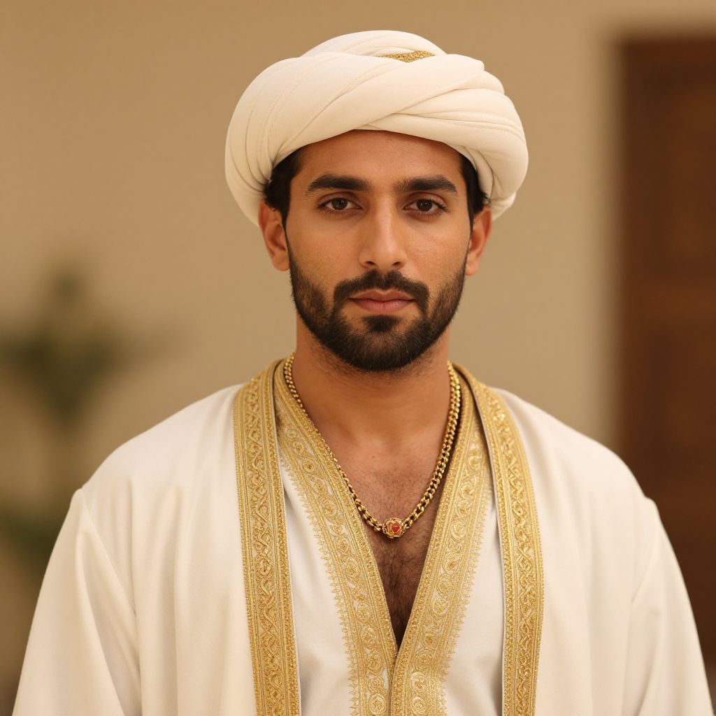 Photograph of a Middle Eastern man with dark brown skin and black beard, wearing a white turban and traditional white robe with gold embroidery. He has deep brown eyes and a serious expression. A gold chain necklace rests on his chest. The background is softly blurred, featuring beige walls and a green plant to the left. The lighting is warm, highlighting the textures of his clothing and the sheen of the gold embroidery. The image has a slightly vintage, soft-focus effect.