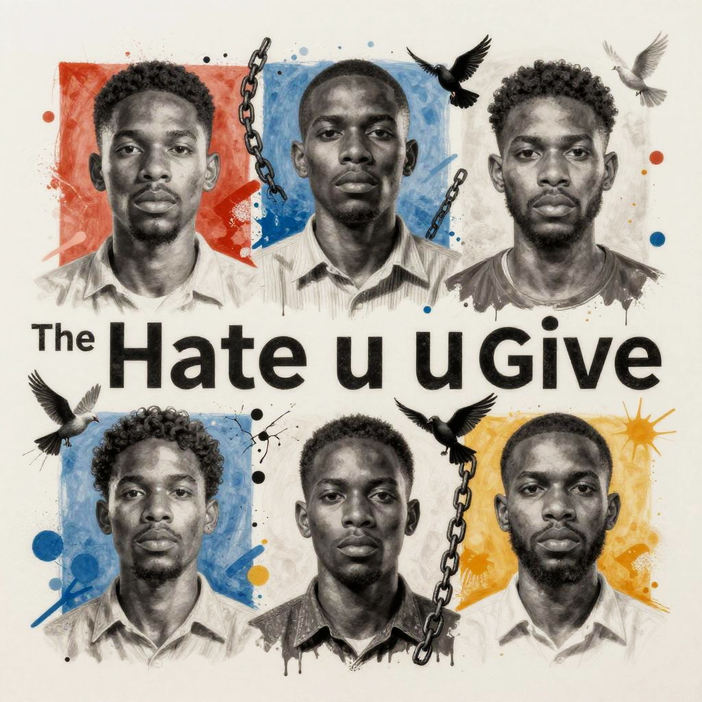 The hate u give drawings depicted as surreal mixed media artwork, blending realistic portraits with abstract splashes of color and symbolic imagery like broken chains and doves, creating a compelling narrative of struggle and hope within social activism.