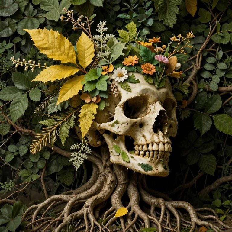 The image presents a striking and intricate composition, dominated by a vegetal skull that appears to be emerging from an elaborate bush. The skull, with its skin made of flowers and leaves, is adorned with a variety of foliage, including large yellow and green leaves, delicate branches, and small, scattered petals. The bush itself is dense and complex, with intertwining roots and a variety of textures, including smooth and rough surfaces. The background features a tapestry made of leaves and roots, adding depth and a sense of continuity to the scene. The lighting is dramatic and photorealistic, casting shadows and highlights that enhance the three-dimensional quality of the elements. The overall composition is dynamic, with the skull and bush interacting in a way that creates a sense of movement and growth.