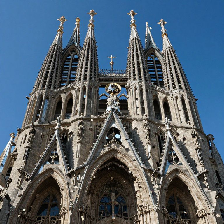 Photograph of a Gothic-style cathedral taken from a low angle against a clear, vibrant blue sky. The cathedral features two tall, intricately designed towers with pointed spires adorned with crosses. The facade showcases detailed stone carvings, large arched windows, and decorative tracery. The sunlight casts sharp shadows, emphasizing the texture and depth of the stone. The symmetrical design includes three prominent arches at the base, each with detailed stonework. The overall color palette is dominated by the warm, beige tones of the stone against the vivid blue sky, creating a striking contrast.