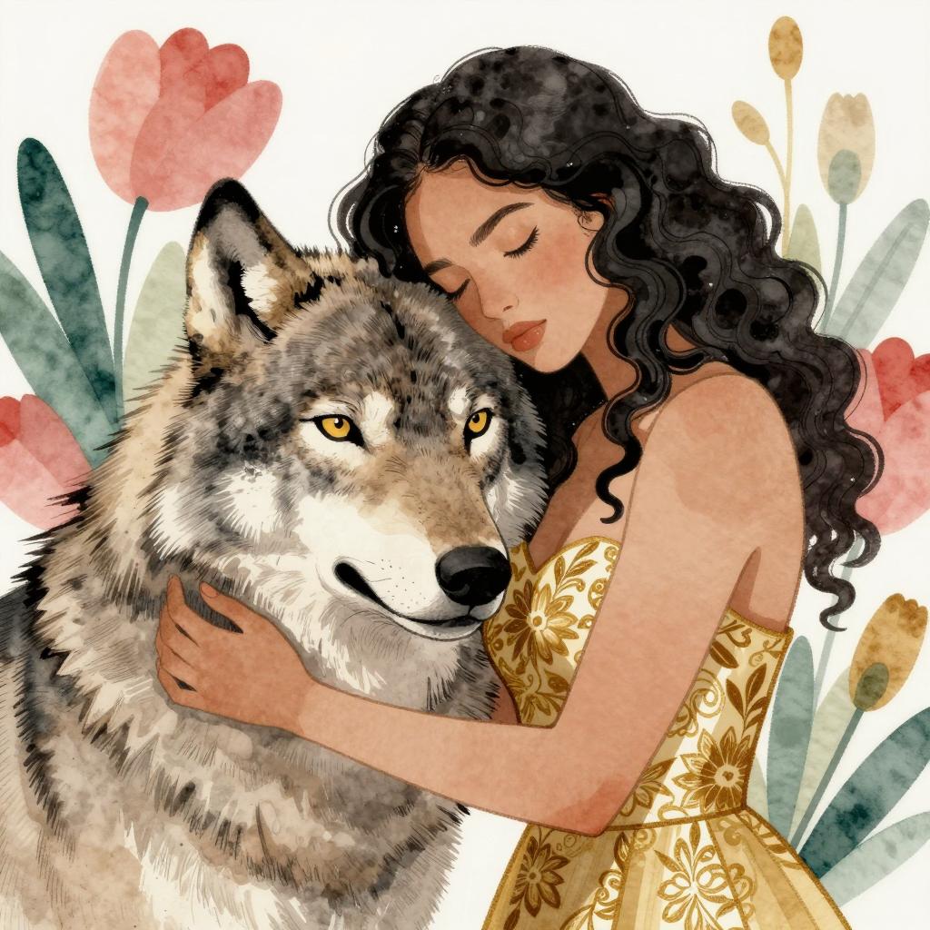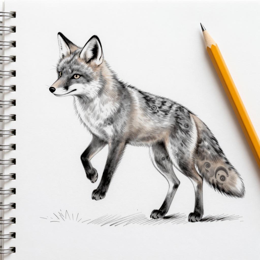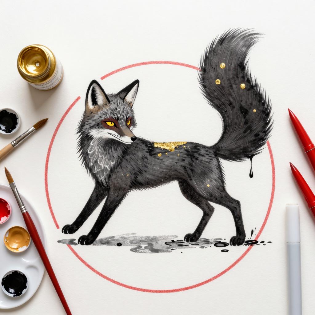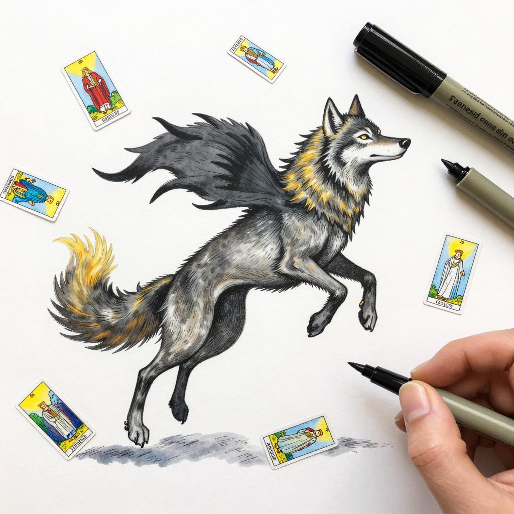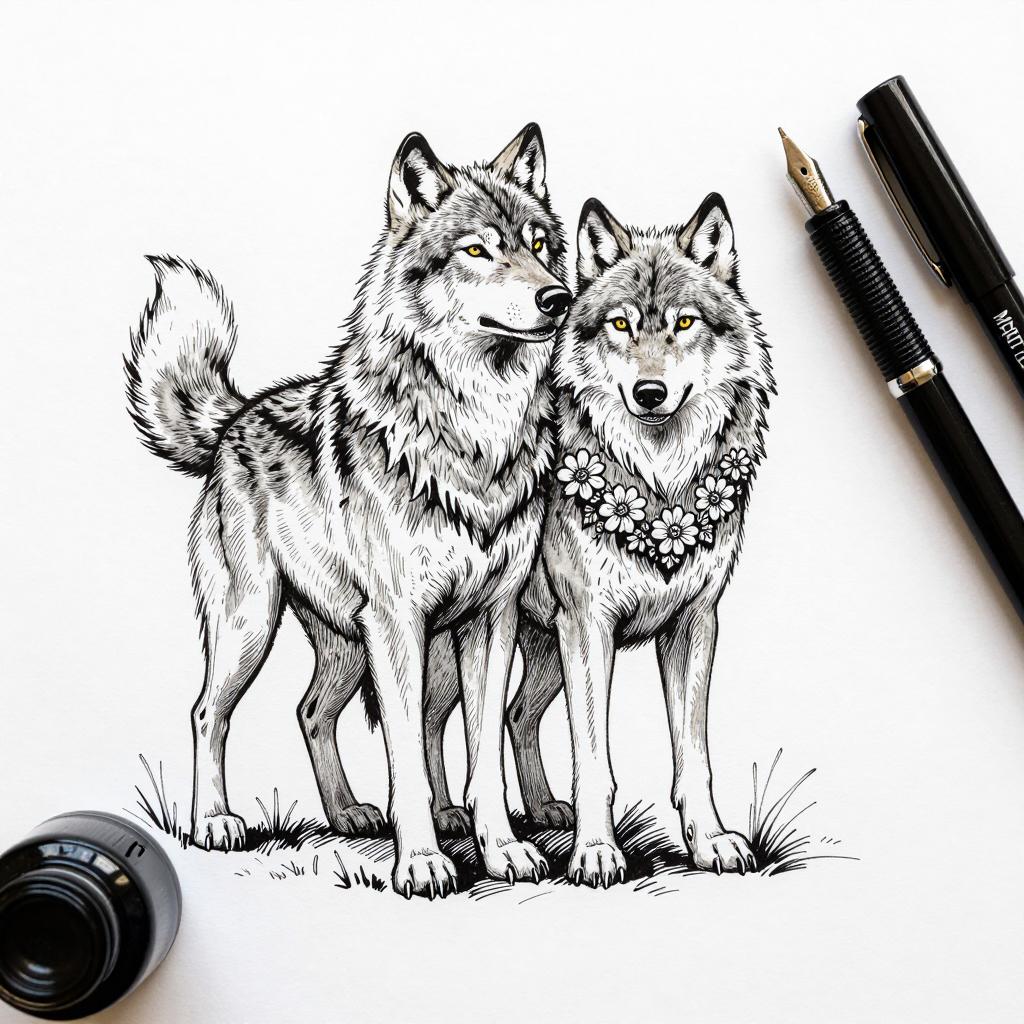 Black ink illustration of two wolves standing upright, intertwined. The wolf on the left has a bushy tail, raised head, and detailed fur ure. The wolf on the right has a mask-like facial marking, flowers around its neck, and a bushy tail. Three black ink pens and a nib rest on the top right. An ink cap is on the bottom left.