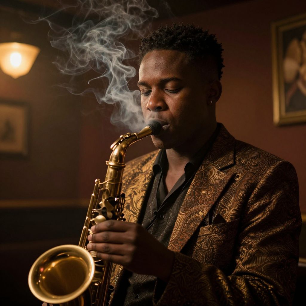 Photograph of a dark-skinned Black man with short curly hair, playing a golden saxophone with visible smoke curling around his mouth. He wears a black button-up shirt and a brown, patterned blazer. The background is dimly lit, featuring a framed portrait on the right and a warm, glowing wall sconce on the left. The image has a rich, moody tone with deep shadows and warm hues, emphasizing the musician's focused expression and the textures of his clothing.