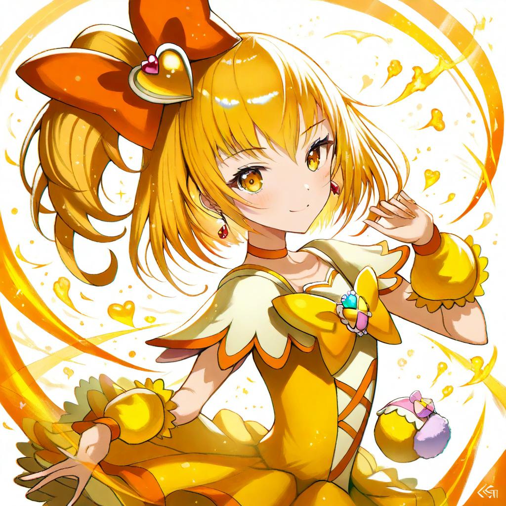 Cure pine, precure, 1girl, yellow eyes, brown eyes, short hair, blonde hair, heart hair ornament, hair bow, orange choker, earrings, magical girl, one side up, magical girl, wrist cuffs, by artist gia, animagine