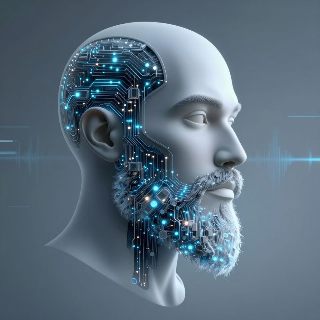 Beard AI theme, cybernetic face profile featuring an advanced AI beard made up of nano-circuits and glowing digital veins, minimalist techno background with subtle pulse effects, high-tech and modern digital portrait style