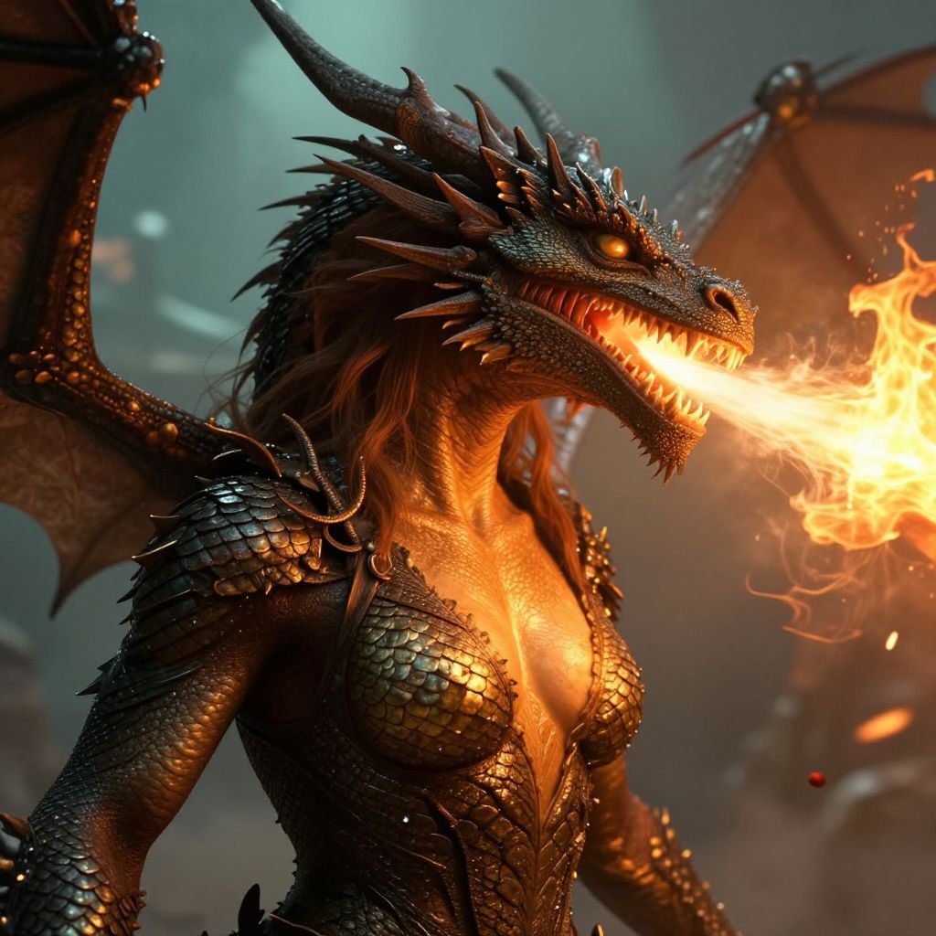 Backdrop a woman dragon , scale skin, masterpiece, scenematic light , adventurous background, breathing fire, chest plan, realistic digital art,