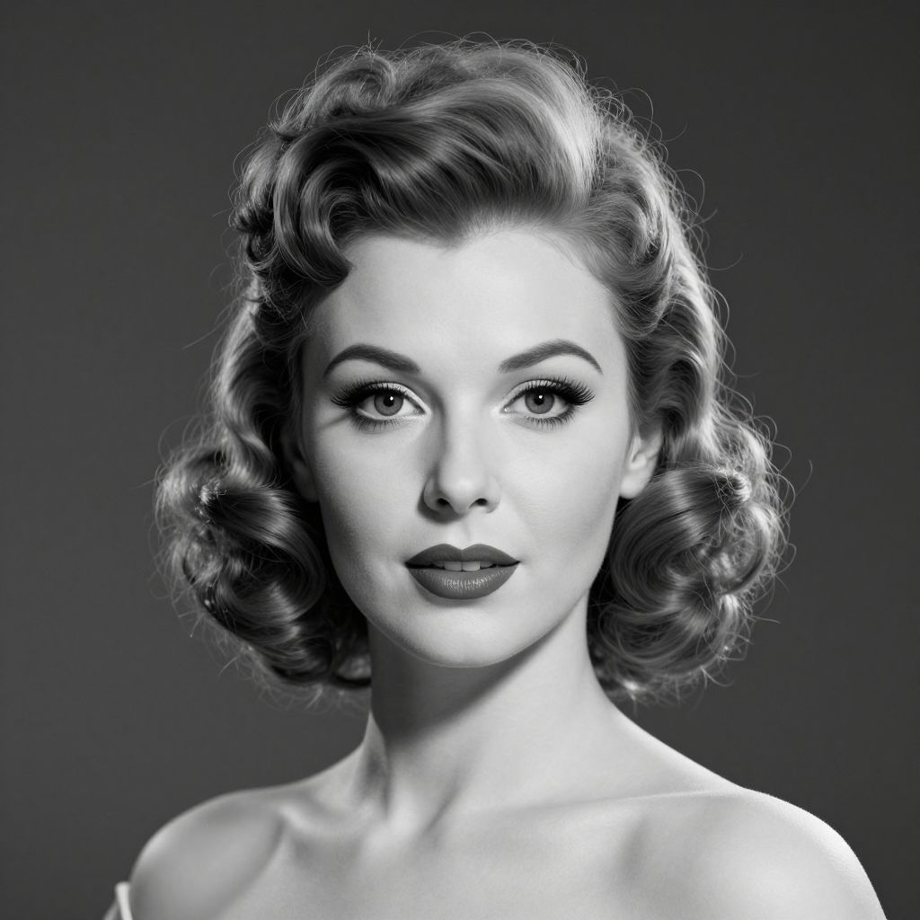 This is a black-and-white, high-contrast photograph of a woman with vintage 1940s-style hair, featuring soft, curled waves. She has a fair complexion, full lips with dark lipstick, and well-defined eyebrows. Her large, expressive eyes are accentuated with thick eyeliner and mascara. She is wearing a strapless top, and the background is a dark gradient, focusing attention on her face. The lighting highlights her facial features and hair texture, giving a classic, glamorous look reminiscent of old Hollywood portraits. The image has a polished, studio-quality finish.