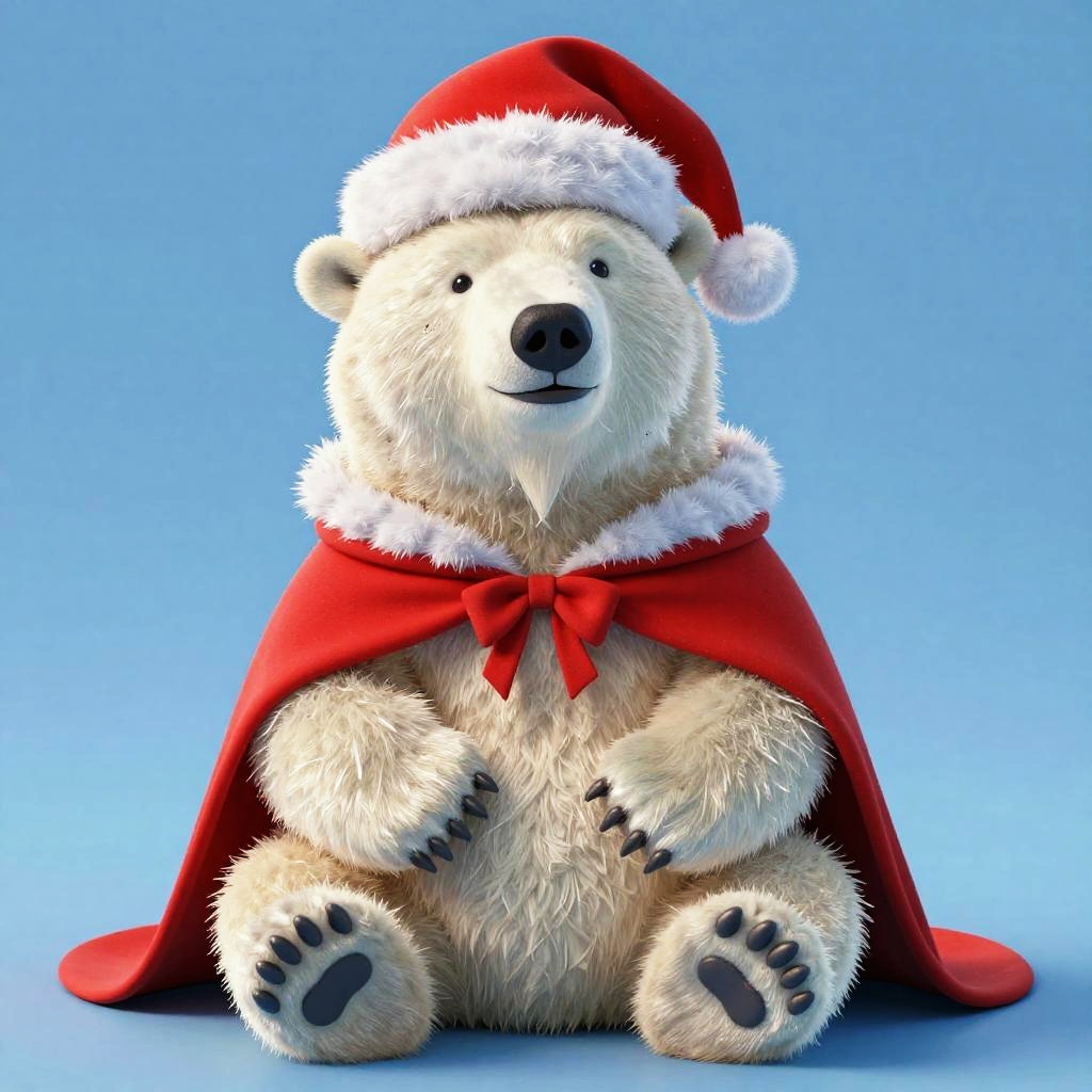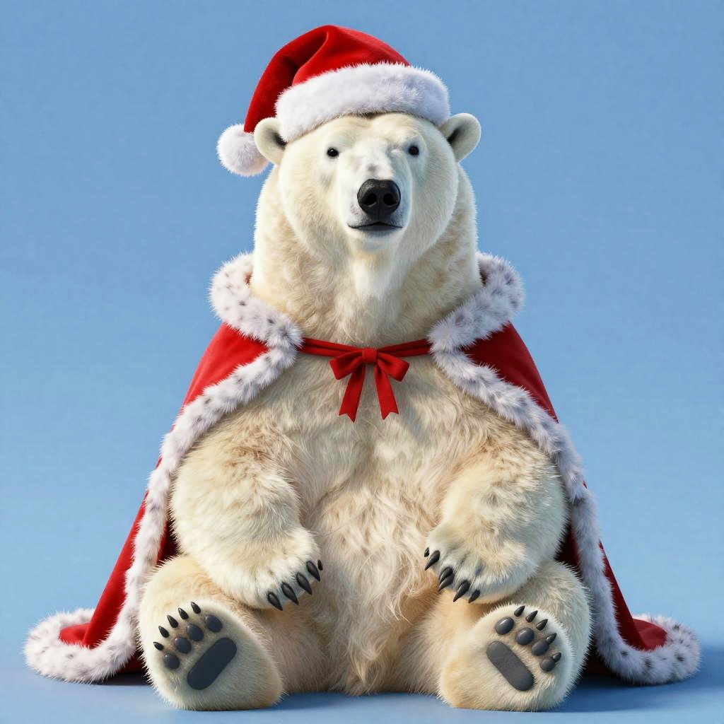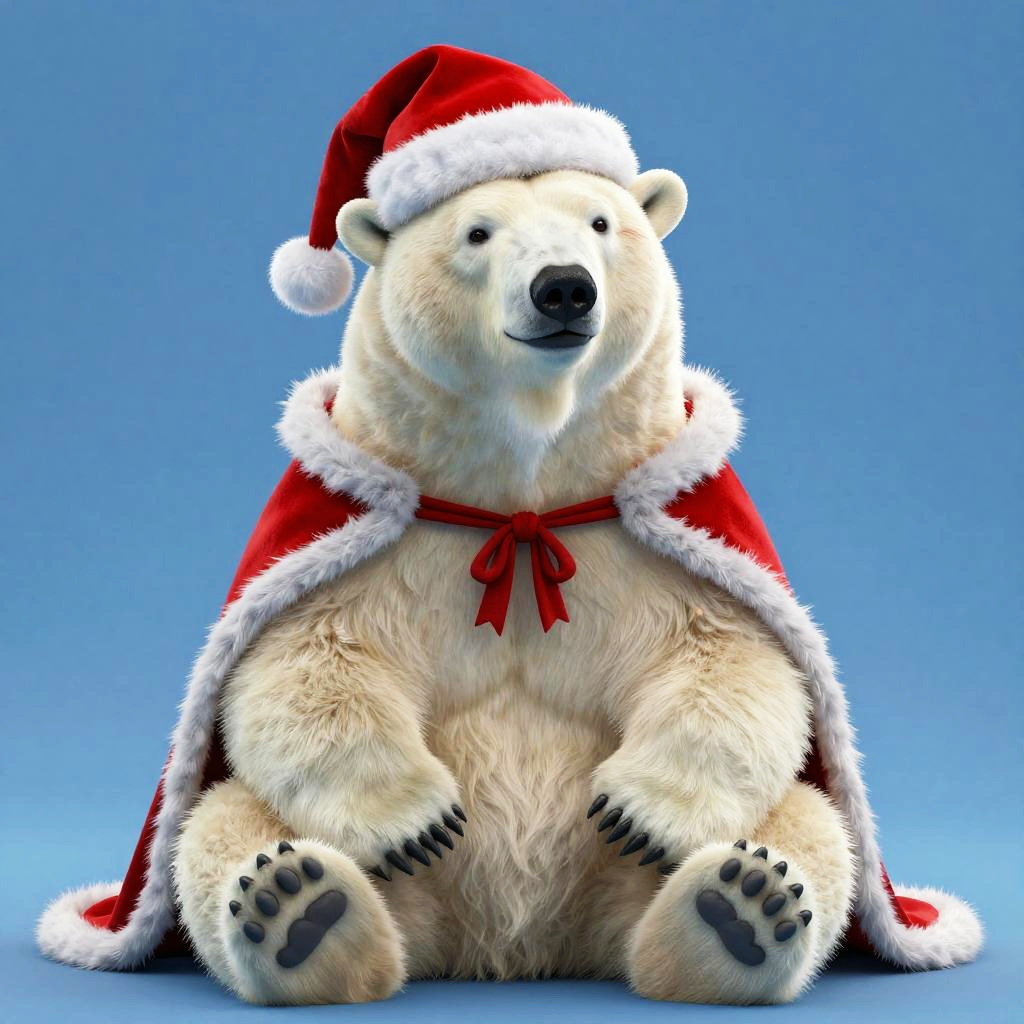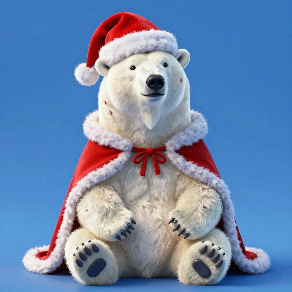 Full body, solo, animal, bear, polar bear, sitting, santa hat, red cape, fur trim, fur-trimmed headwear, young adult polar bear with ice-blue eyes, sleek glossy fur and a small scar above the left brow, warm gentle smile, sitting upright with one paw raised as if waving, blue background