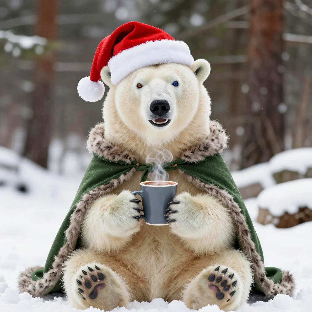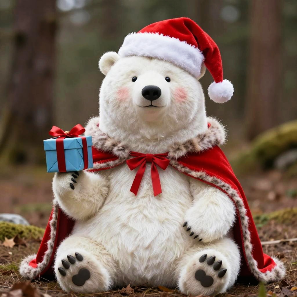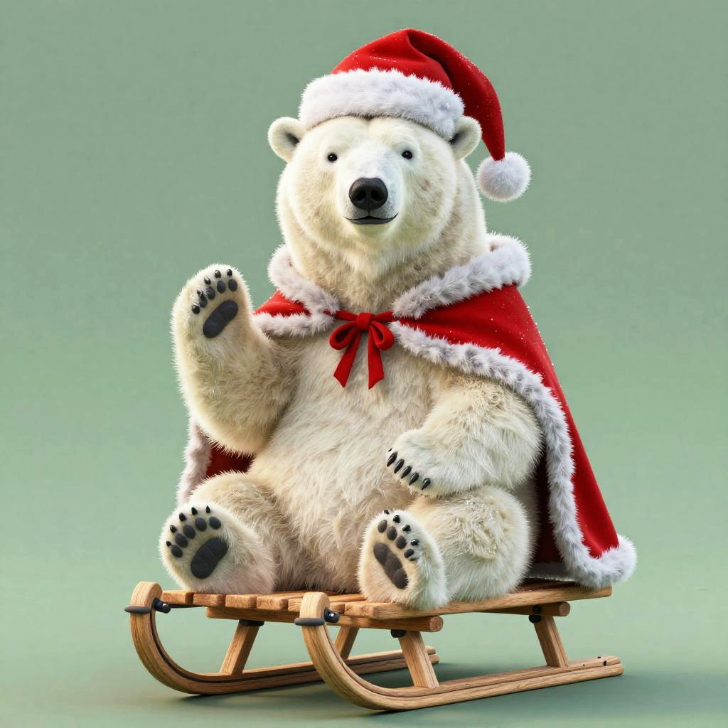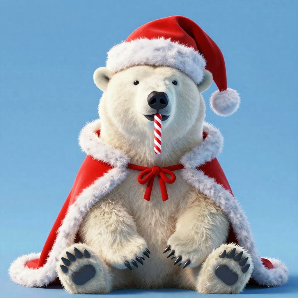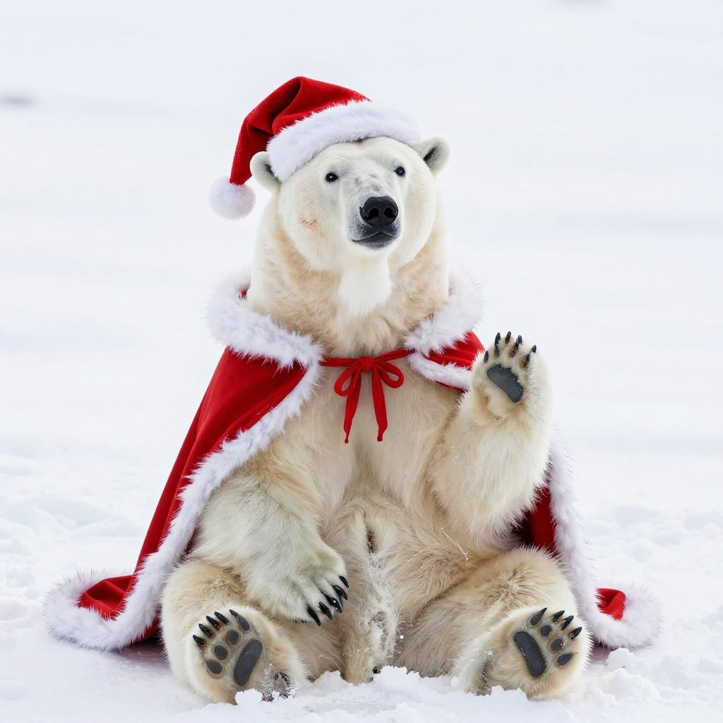 Full body, solo, animal, bear, polar bear, sitting, santa hat, red cape, fur trim, fur-trimmed headwear, young adult polar bear with ice-blue eyes, sleek glossy fur and a small scar above the left brow, warm gentle smile, sitting upright with one paw raised as if waving, blue background