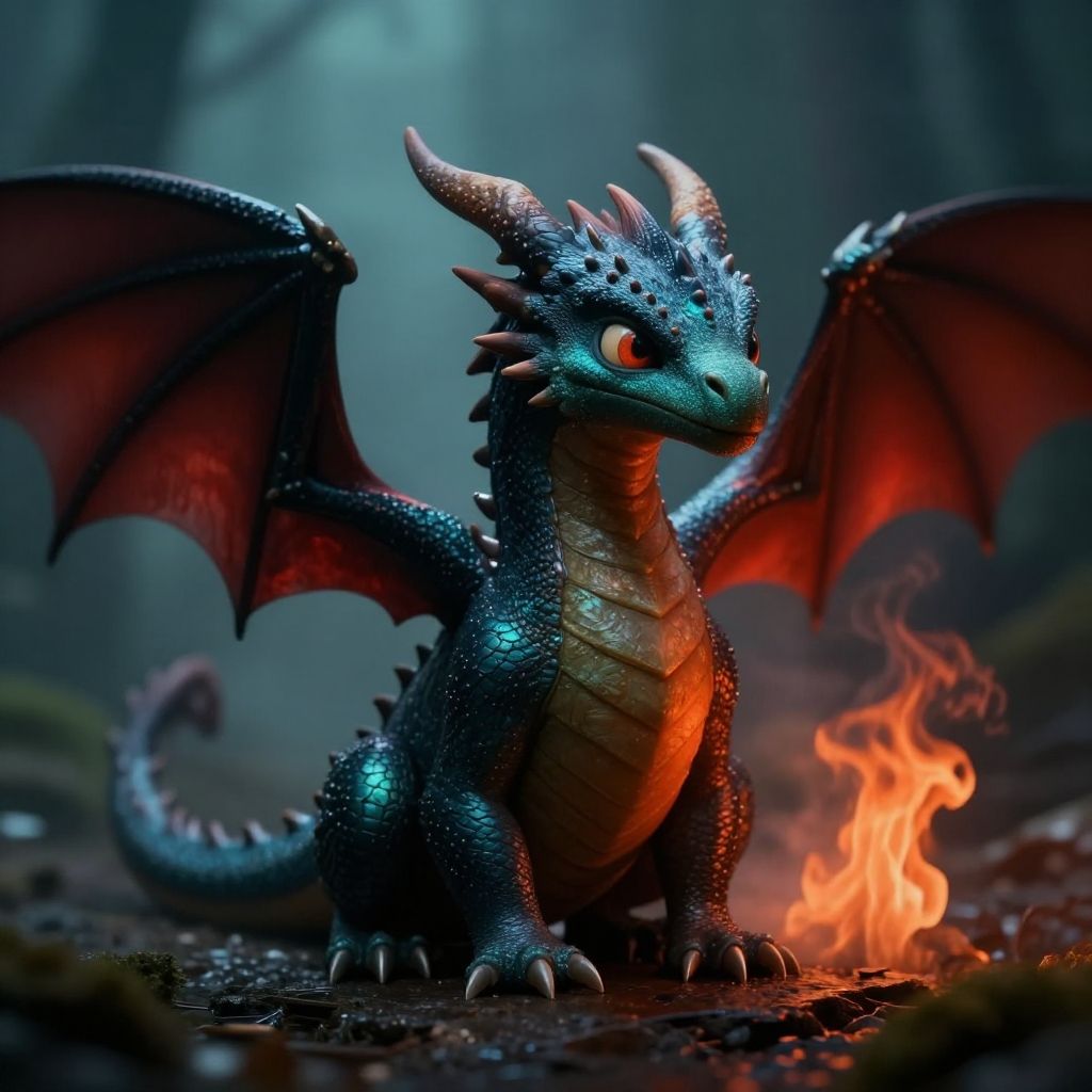 Realistic, cinematic, fantsy style of a cute dragon smolder