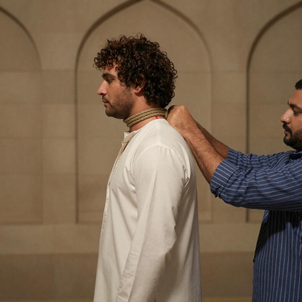 Photograph of a man with curly brown hair, wearing a white, long-sleeved, traditional garment, standing against a stone wall with arch-shaped patterns. He is being restrained by a person in a blue and white striped shirt, who is holding a rope around his neck. The scene is lit with warm, dramatic lighting.