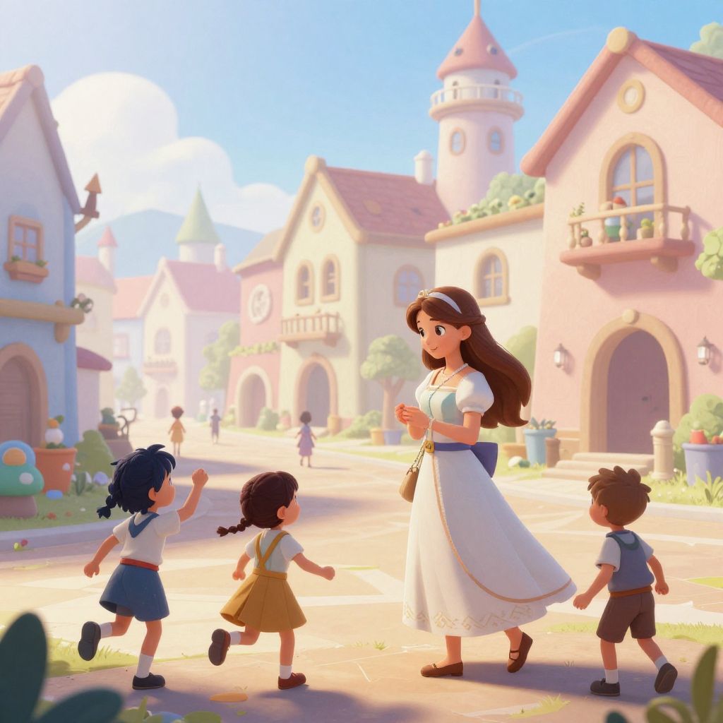 This digital artwork depicts a bright, sunlit village scene with a medieval European architectural style. In the foreground, a blonde woman in a long pink dress with a white blouse and black belt stands holding a staff, looking contemplative. Surrounding her are children with backpacks, running and playing; they are dressed in simple, colorful clothes. The background features charming, pastel-colored buildings with pointed roofs, flower boxes, and arched windows. The sky is clear and blue, and sunlight casts warm, soft shadows. The overall style is reminiscent of a whimsical, animated film, with vibrant colors and gentle, playful lighting.