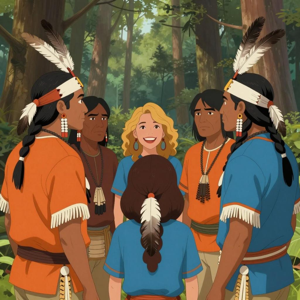 Illustration featuring five Native American people standing in a forest clearing. Four men wear traditional attire with orange and blue shirts adorned with white fringes, feathered headbands, and beaded necklaces. A blonde woman with curly hair and blue shirt smiles brightly in the center of the group. Tall trees and lush greenery form the forest background.