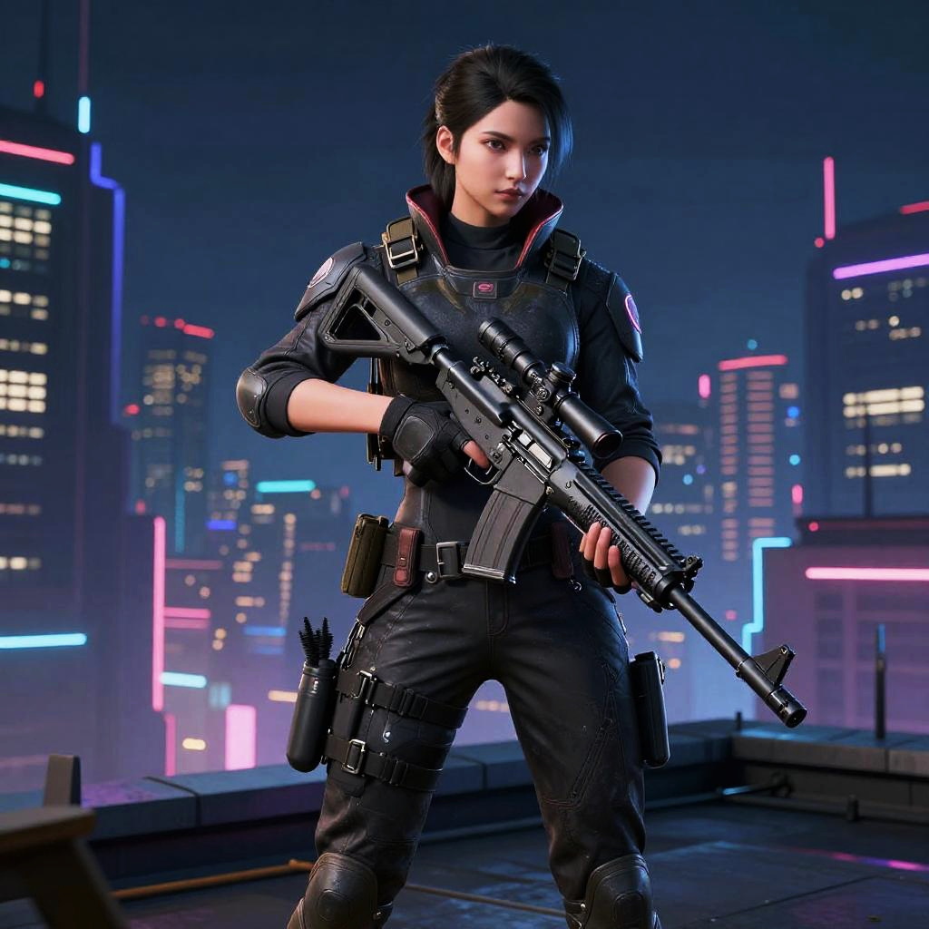 Recon Phantom Valorant agent in futuristic tactical gear, holding a sleek high-tech sniper rifle, standing poised on a neon-lit rooftop at night with a cyberpunk city skyline in the background, intense atmosphere, ultra-detailed digital art.