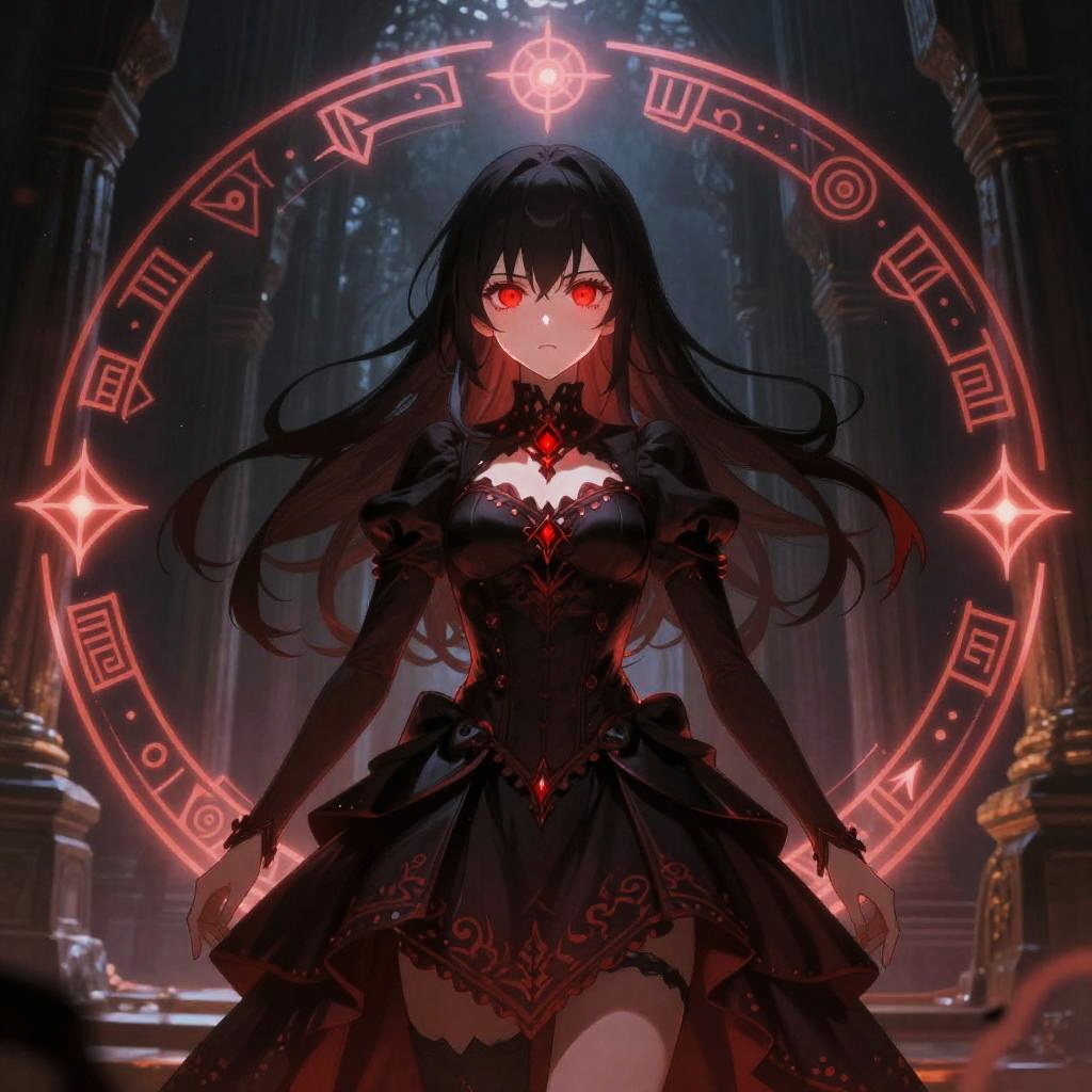 Red eye anime girl with fiery red irises wearing a dark gothic dress, surrounded by swirling magical runes, in an ancient ruined temple, eerie glowing symbols cast dramatic shadows, delicate but commanding expression, highly detailed fantasy art style.