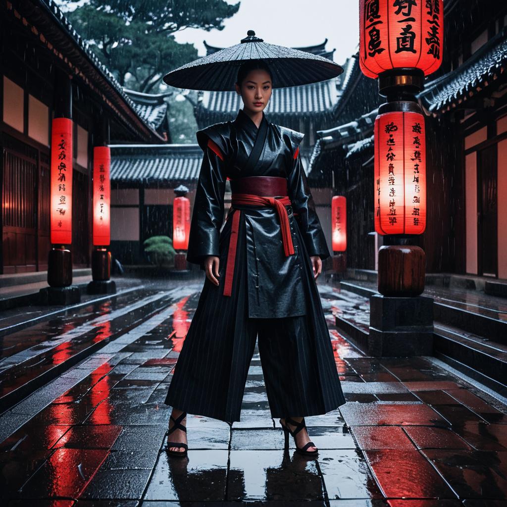 Enigmatic Shadow Monk in Rain-Soaked Jinja Courtyard
