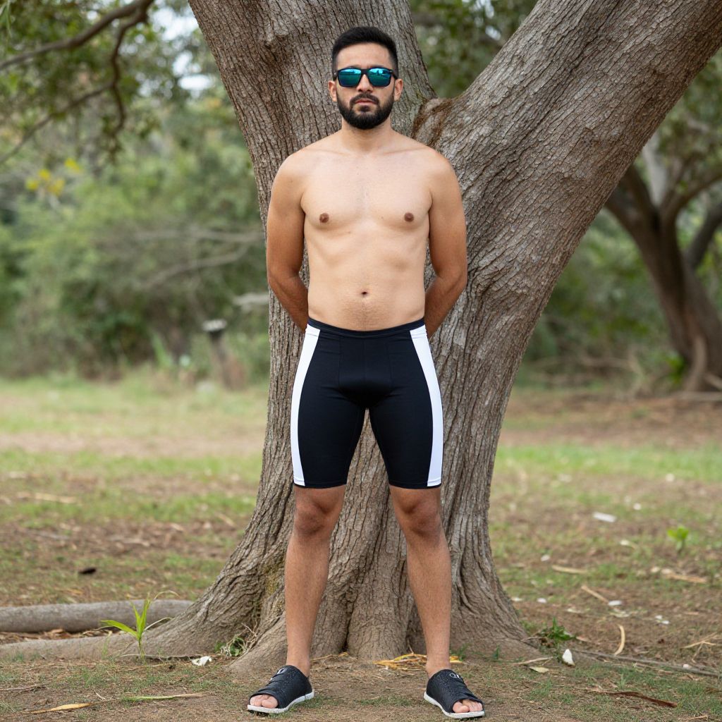 Photograph of a shirtless, medium-build man with a trimmed beard and dark hair, standing against a large tree trunk in a forested area. He wears black athletic shorts with white stripes, black flip-flops, and reflective blue sunglasses. His hands are behind his back. The background features blurred greenery and trees, with a grassy, slightly muddy forest floor. The lighting is natural, highlighting his light brown skin and muscular build. The overall image has a slightly exaggerated, almost cartoonish style, with enhanced colors and clarity.