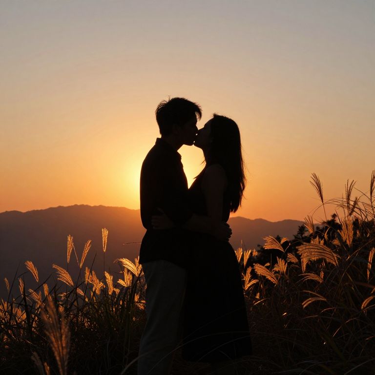 Silhouetted couple kissing at sunset, surrounded by tall grass, with a vibrant orange and purple sky in the background. Photographic image.