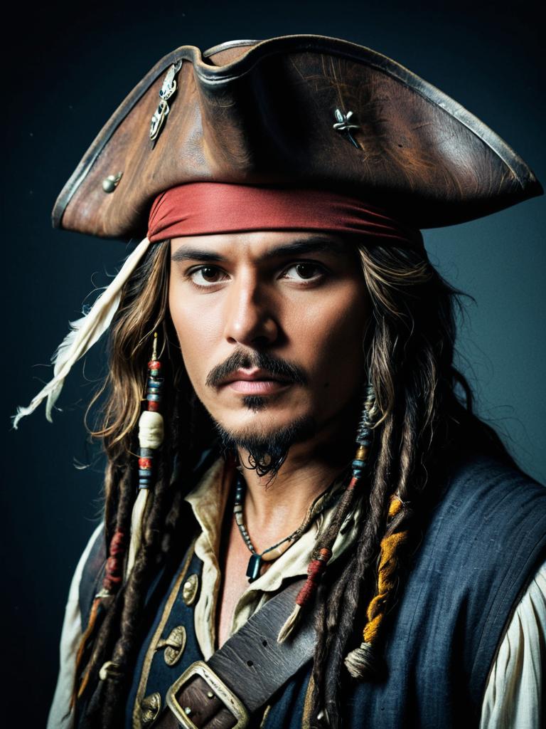 Man in Jack Sparrow Costume, photorealistic detailed studio portrait