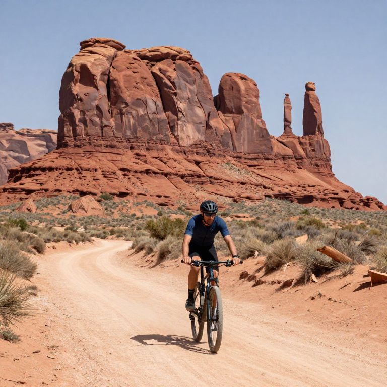 Riding the pulse of adventure, the cyclist navigates a dusty trail where the earth whispers ancient stories, the wind carries the promise of freedom, and the towering red rocks stand as silent sentinels of timeless serenity.