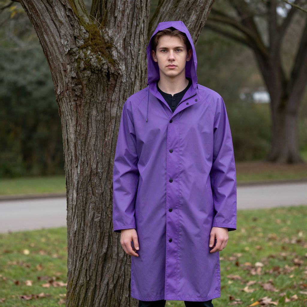 Purple Clothes Costume, young man in a purple rain coat standing in front of a tree