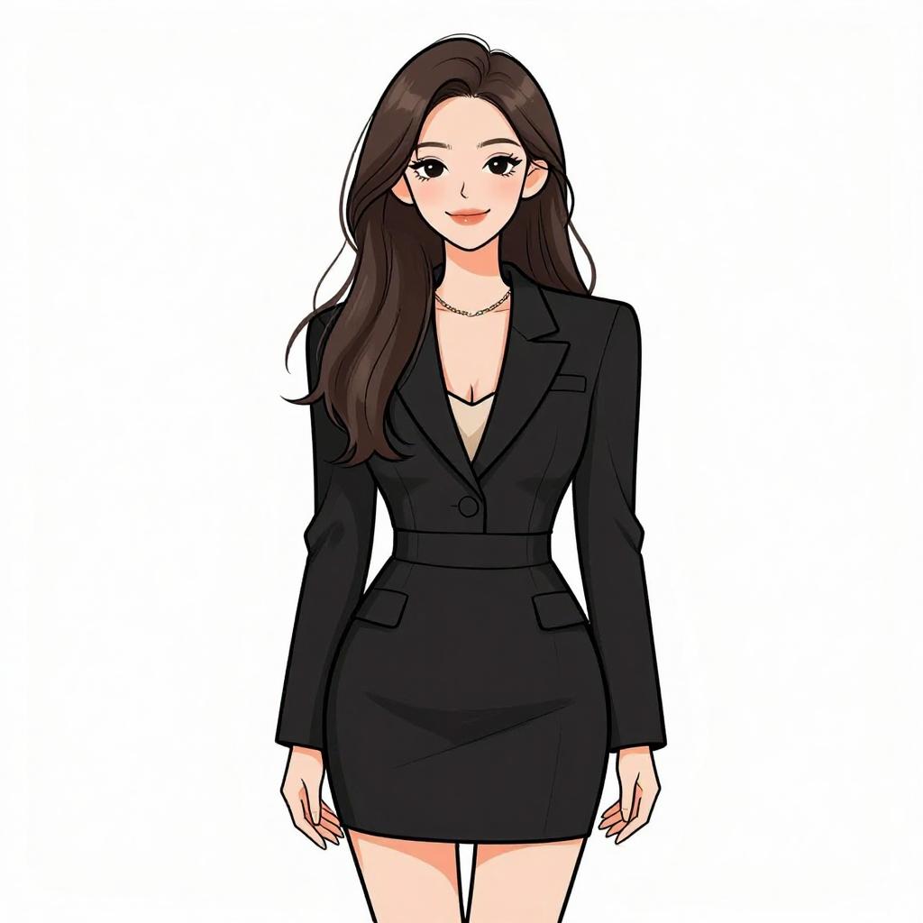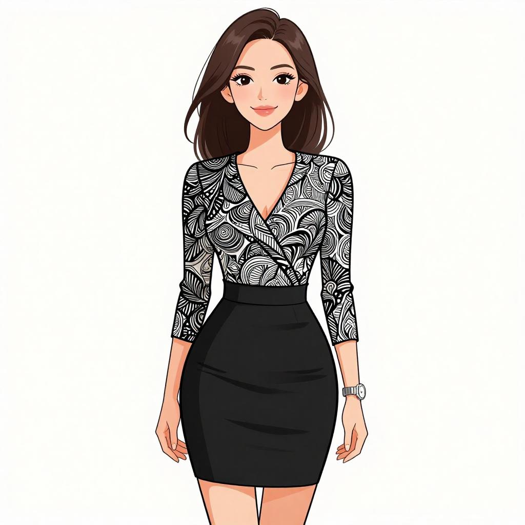 Woman with pretty face and pretty hair. smiling Woman, chic, black fitted blazer with notched lapels, three-quarter sleeves, paired with a contrasting white flared skirt with a black windowpane check pattern, knee-length, fitted black top with a scoop neckline underneath the blazer. --sref 1467
