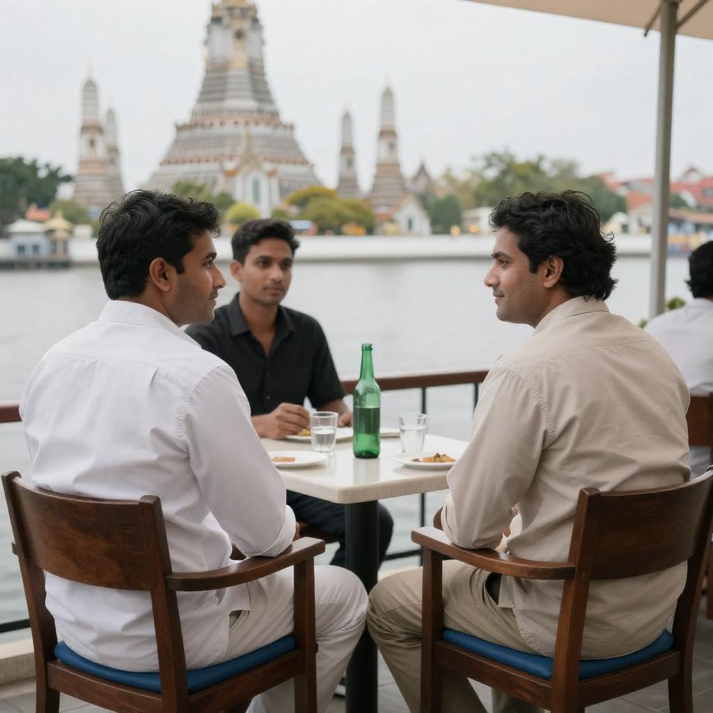 Photograph of three men sitting at a riverside café. Two men in white and beige shirts, one with short dark hair and the other with medium-length dark hair, converse with a man in a black shirt. Background features a river and ornate, temple-like buildings. The men sit on wooden chairs with blue cushions, a table with a green bottle and glasses in front of them.