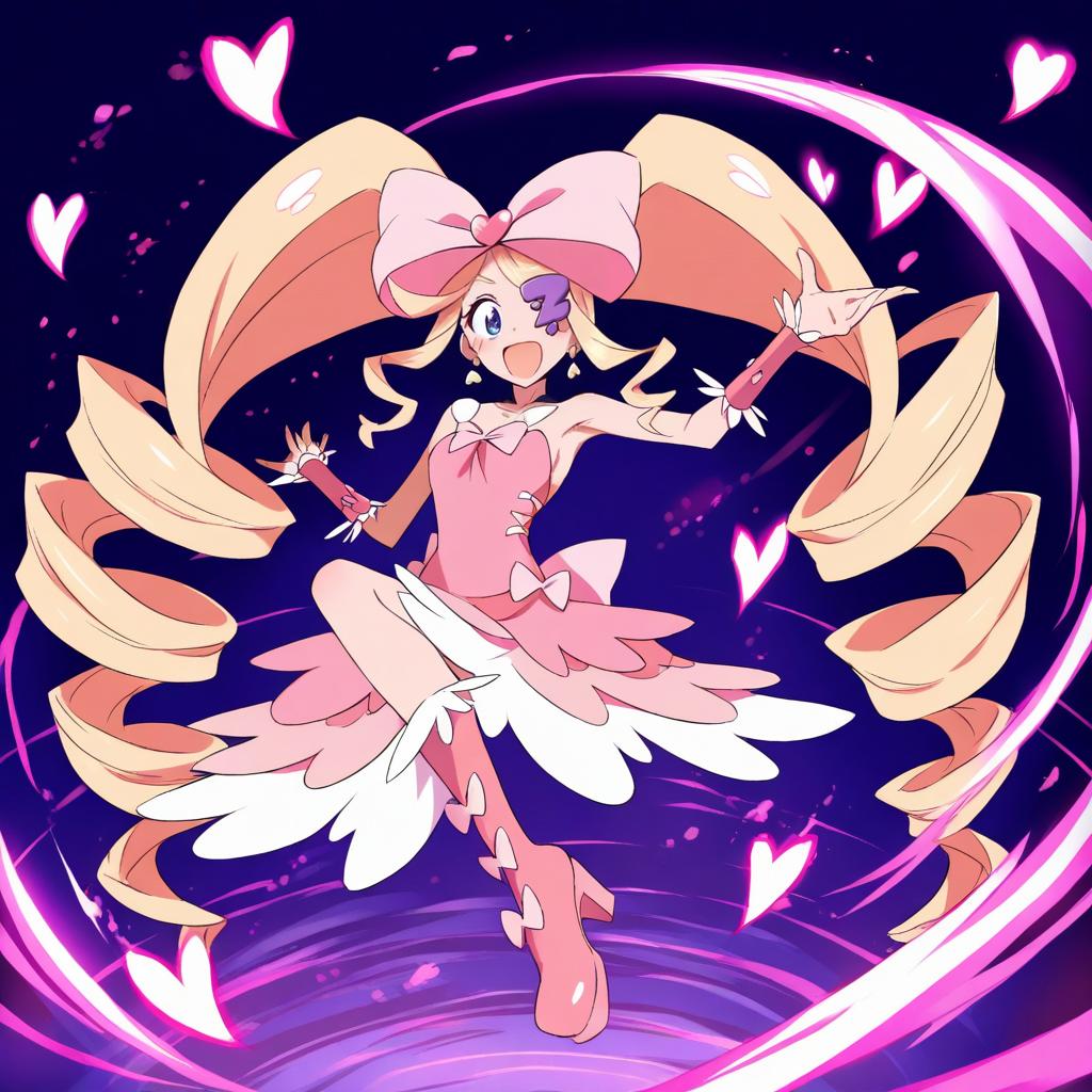 Harime nui, kill la kill, 1girl, blue eyes, eyepatch, blonde hair, big hair, long hair, twintails, hair bow, strapless dress, pink footwear, boots, pink dress, pink bow, huge bow, earrings, twin drills, wrist cuffs, heart, by artist mosha, animagine