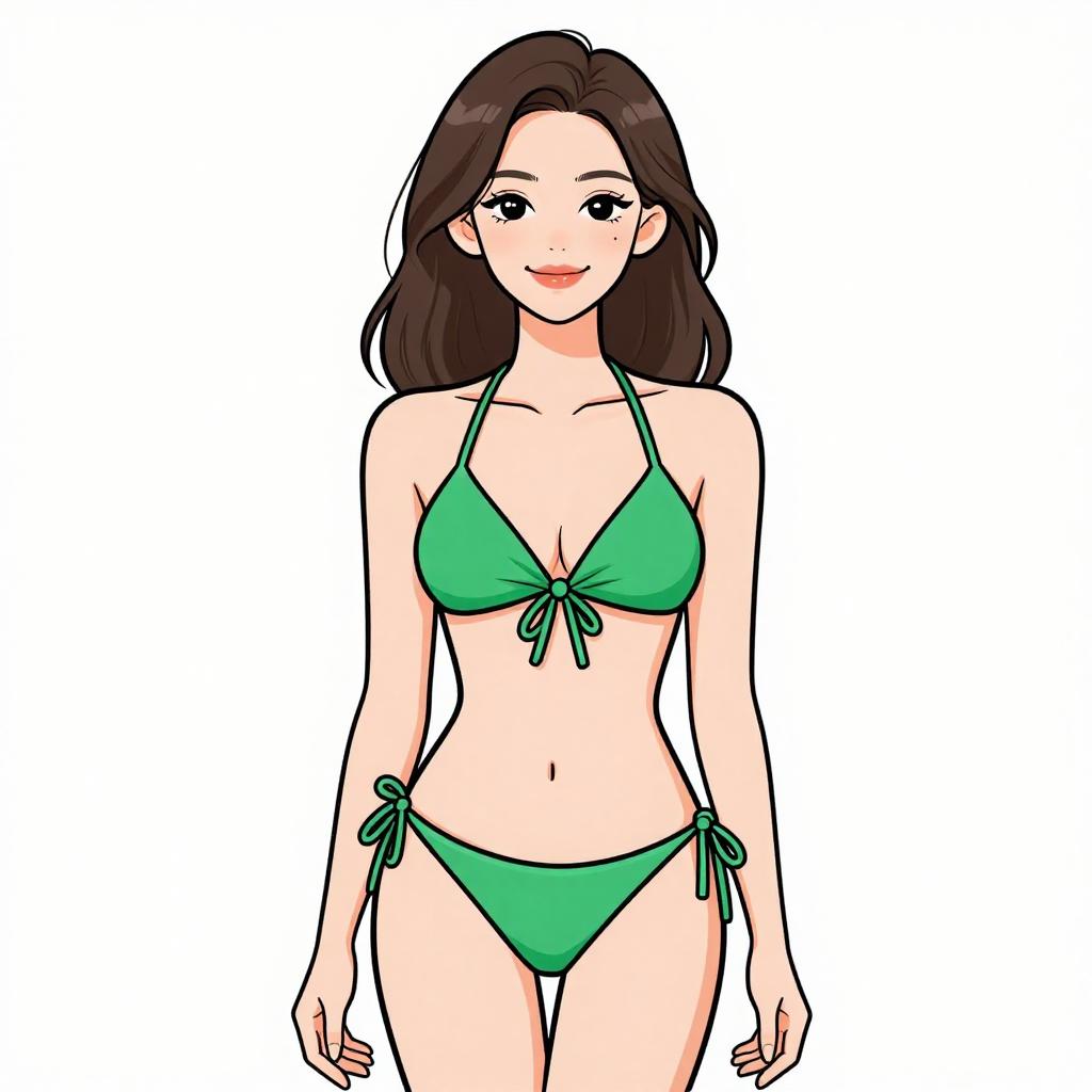 Digital drawing of an Asian woman with fair skin and long, dark brown hair. She is wearing a green string bikini that accentuates her slim, hourglass figure. The bikini top ties in the center and the bottoms have side ties. She has a gentle smile and large, dark eyes. The background is plain white, making her the focal point. The drawing style is clean and colorful, reminiscent of anime or manga art. Her expression is calm and confident.