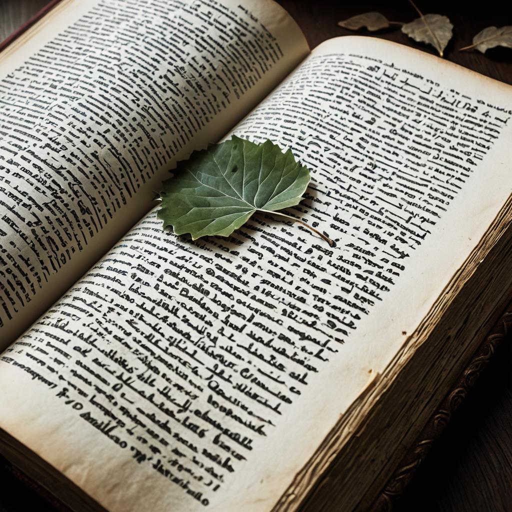 A close-up of an open antique book with visible text, digital art inspired by Hayao Miyazaki, Carl Warner, featuring floating parchment leaves, spectral ink patterns, hyper-realistic, 8k resolution, ray tracing
