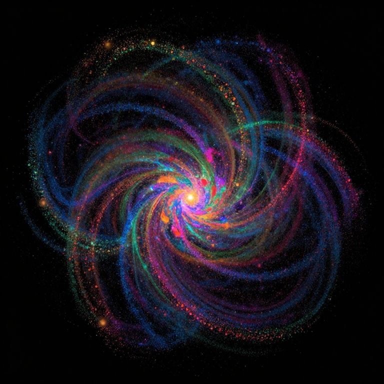 Abstract representation of dpm++ sde with colorful particle diffusion in a dark void, particles forming complex patterns and trajectories resembling a cosmic nebula, blending scientific visualization with surreal aesthetics