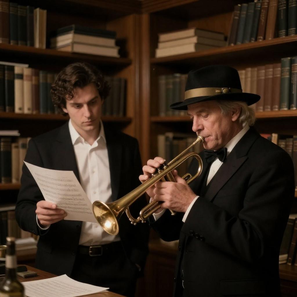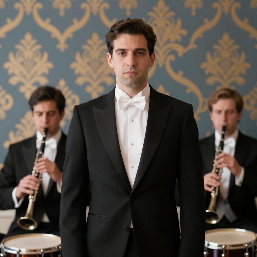 Photograph of a formal event featuring a man in a black tuxedo with a white bow tie, standing in front of an ornate, gold-patterned blue wallpaper. He has short, dark hair and a serious expression. In the background, another man in a similar tuxedo plays a clarinet. A drum is partially visible in the foreground.