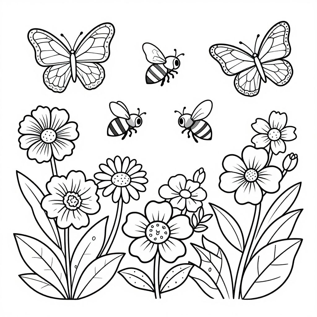 Clip art coloring pages presenting a garden scene full of butterflies, bees, flowers, and leaves, rendered in crisp black outlines with artistic detail yet ample coloring space, natural and soothing atmosphere, crafted for coloring enthusiasts of all ages
